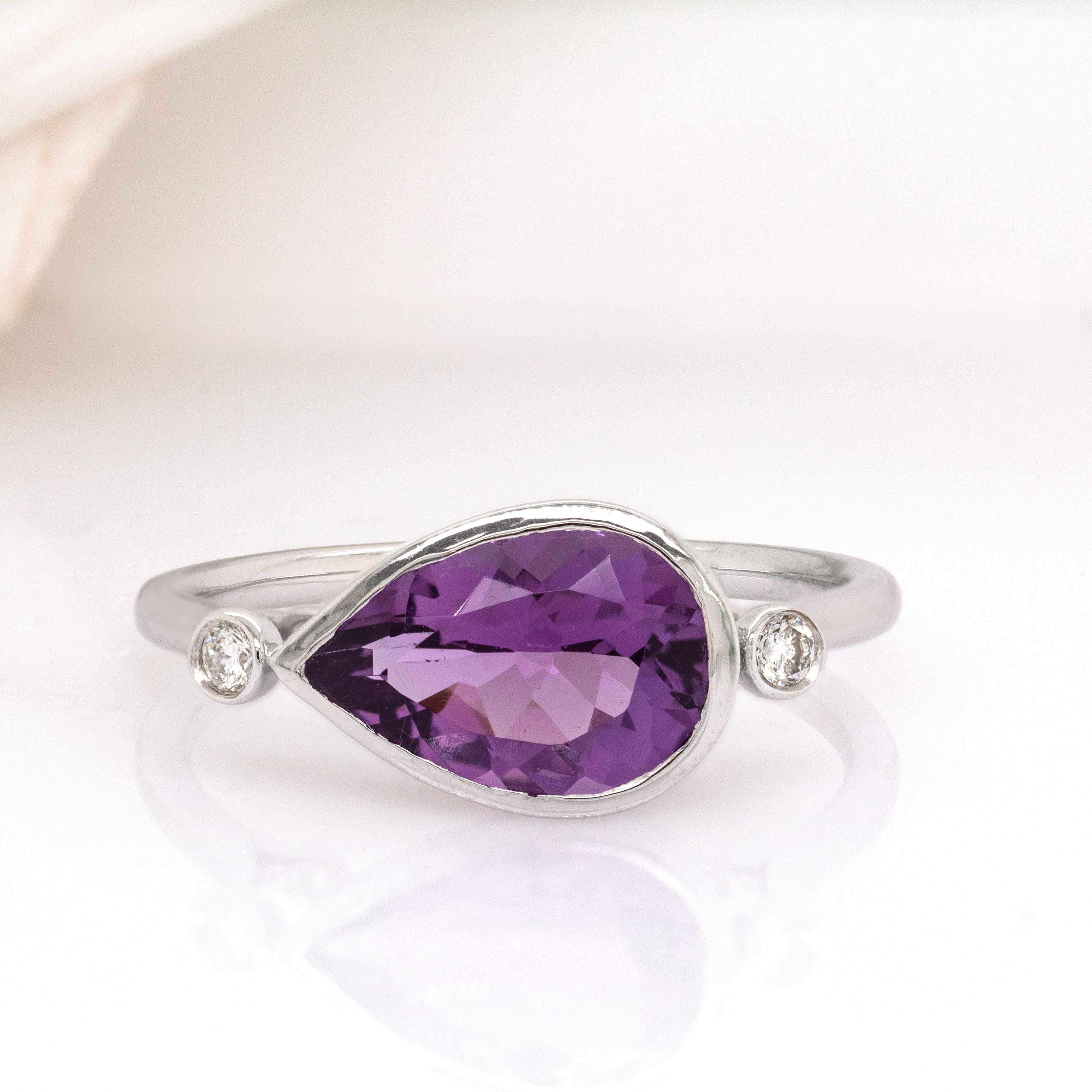 Twilight Solid 14K Gold Zambian Amethyst Ring with Natural Diamonds, Pear 12x8mm