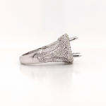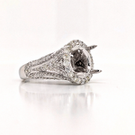 A bold ring setting featuring a halo of round diamonds and a diamond studded tapered shank with regal design elements. Available in both solid and dual tone gold color options, it can be customized for your center stone.