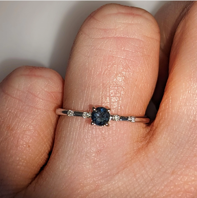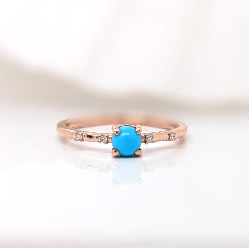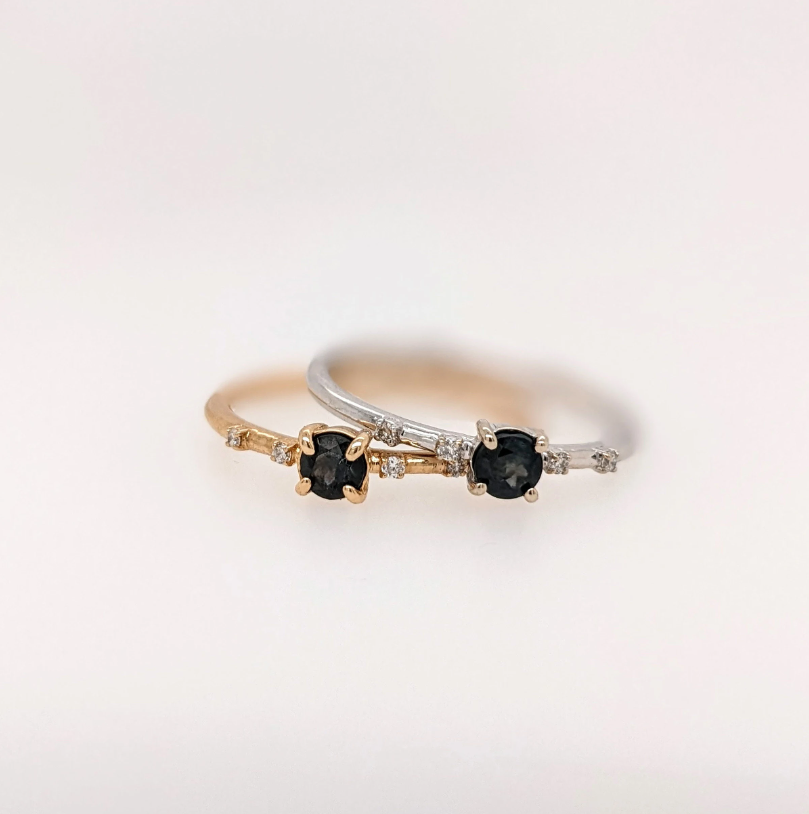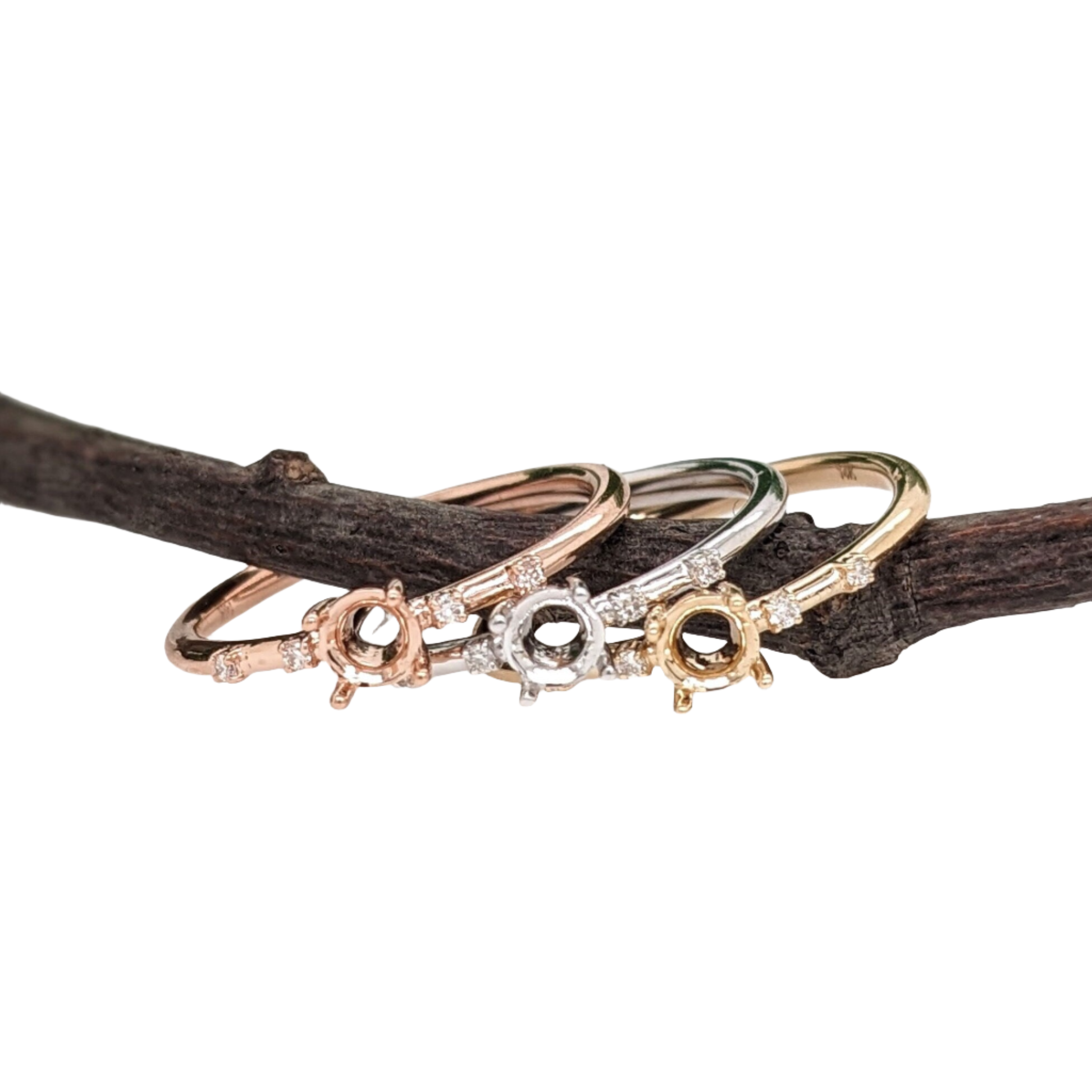 Adorable and chic dainty ring design with diamond accents on the band and a round center setting. A lovely gift ring, choose a birthstone, your favorite stone, or ask us for suggestions! Available in multiple colors of 14k Gold: Yellow, White and Rose.