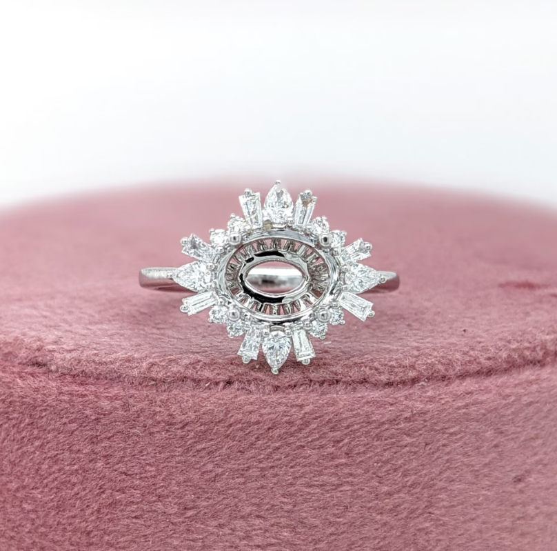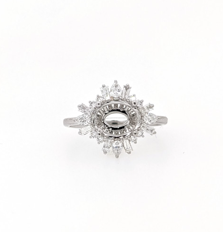 Aurora Collection Mixed Pear, Baguette & Round Ring Setting w Diamond Halo