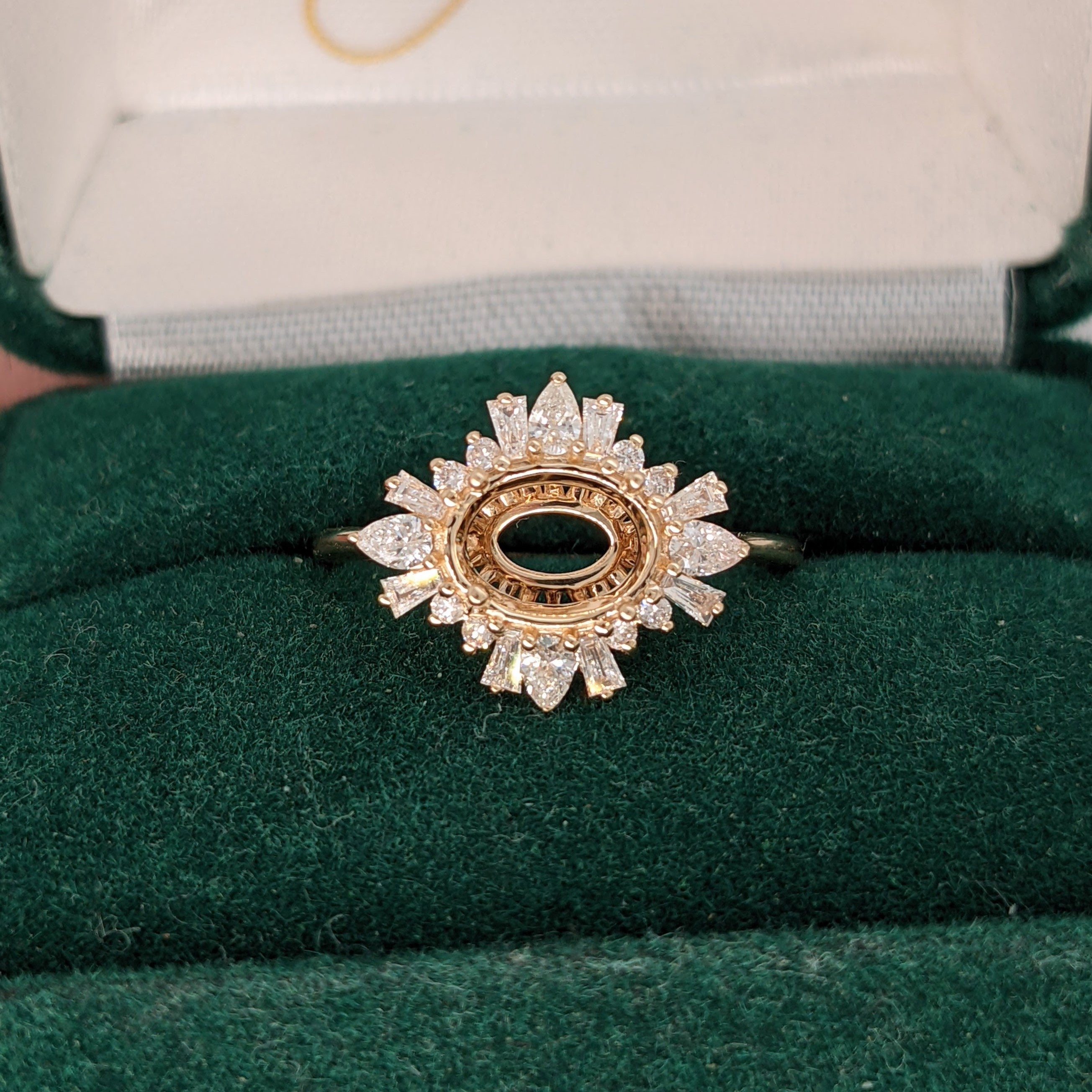 A balanced mix of pear, baguette and round accent diamonds create this unique halo ring setting with an east west oval basket and a straight shank. Available in both solid and dual tone gold color options, it can be customized for your center stone.