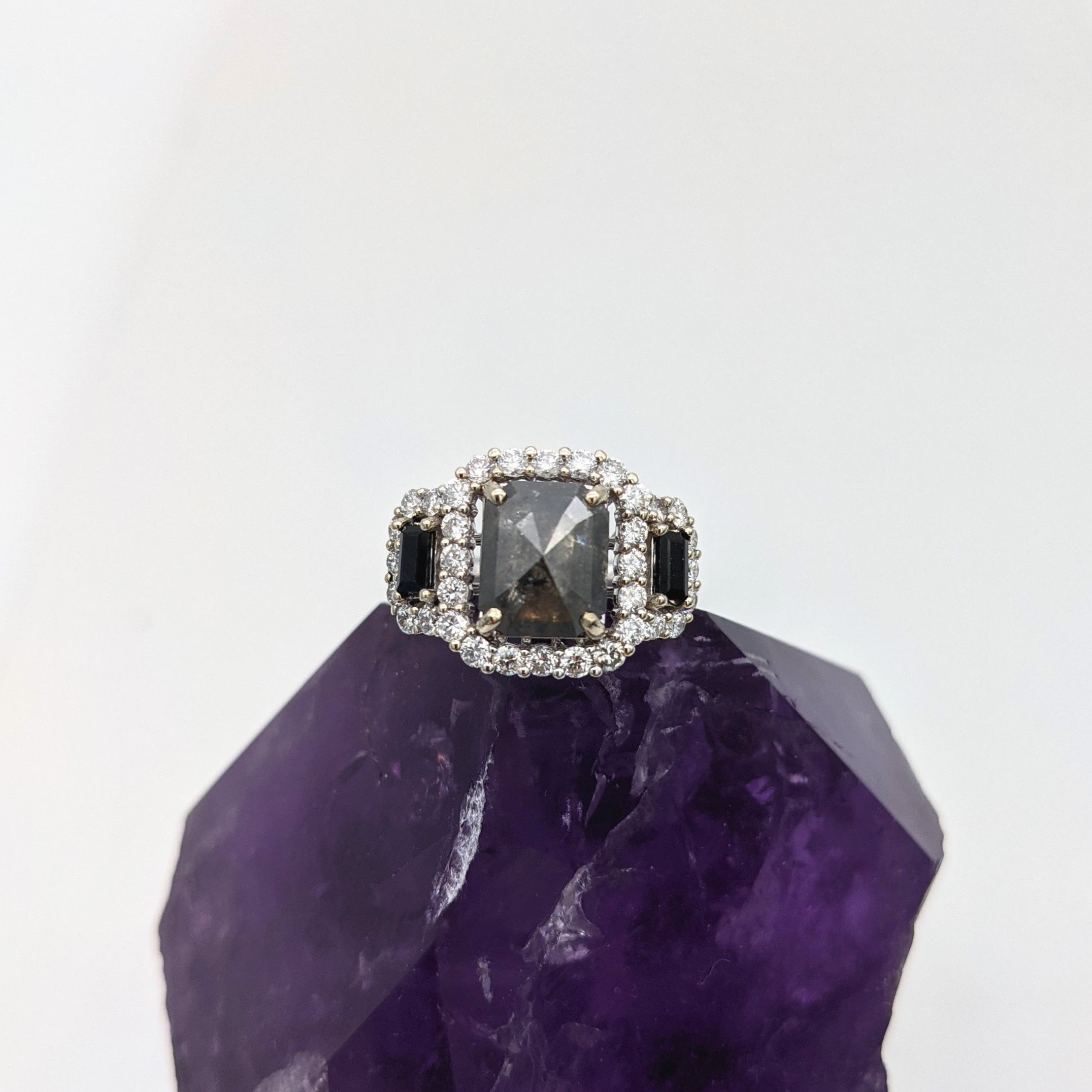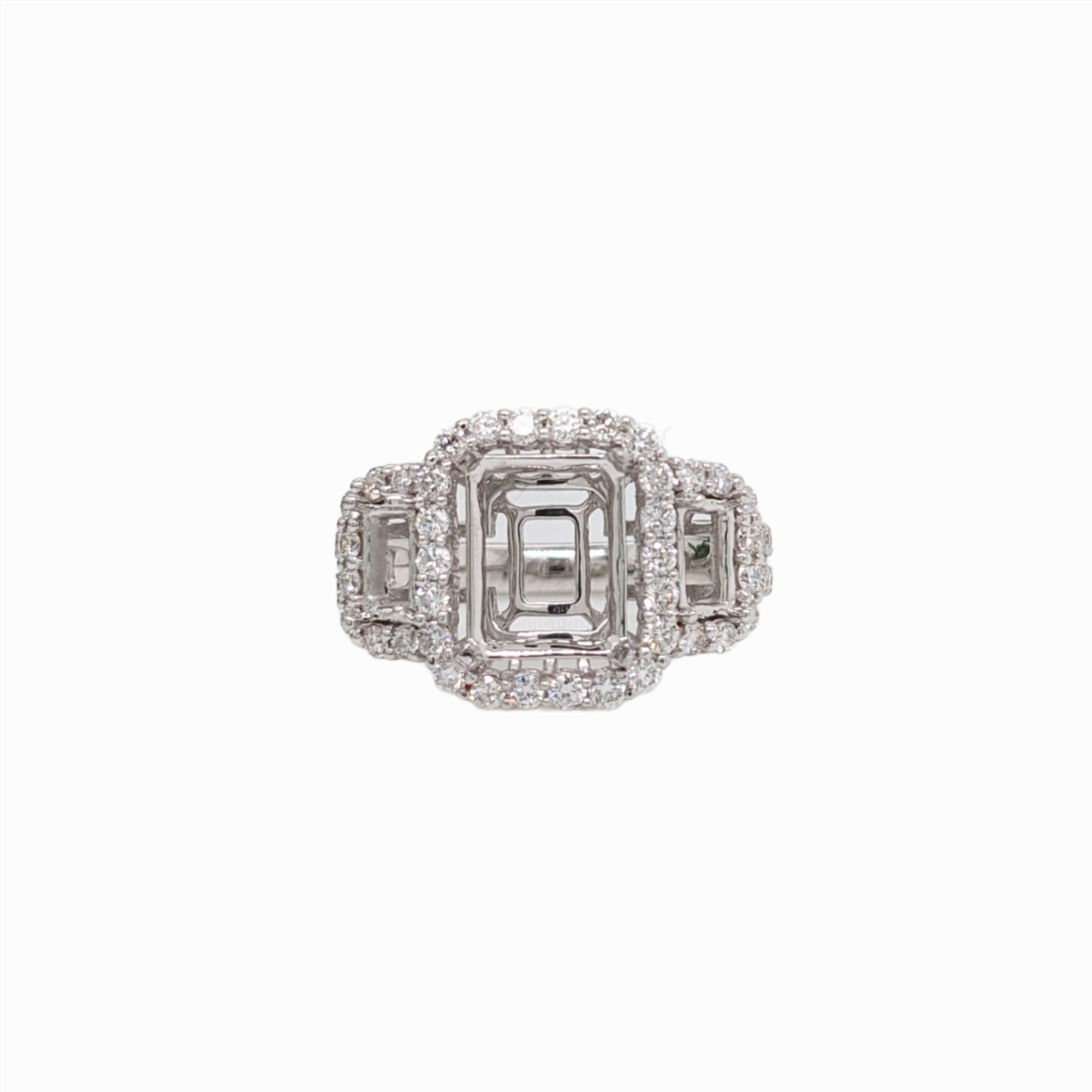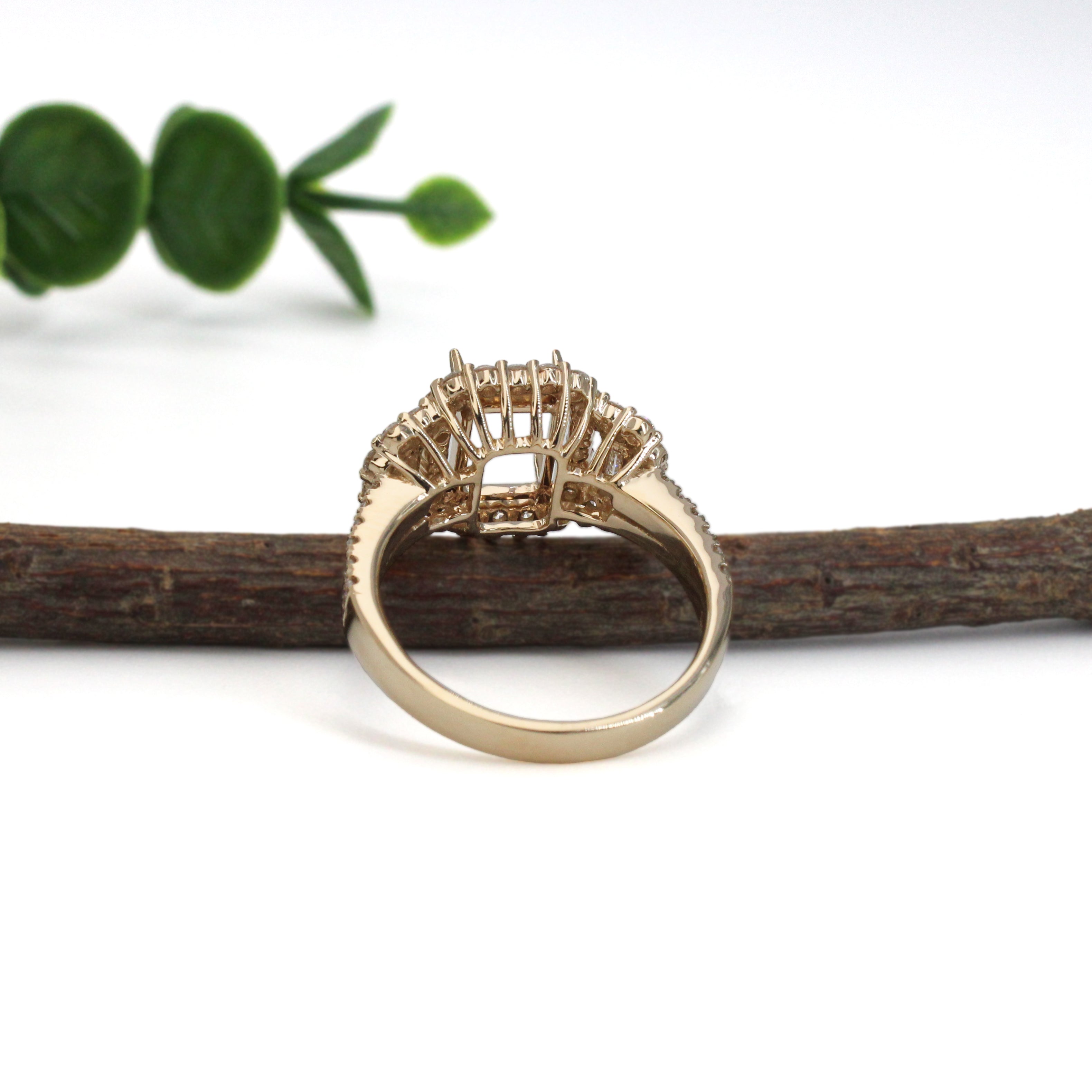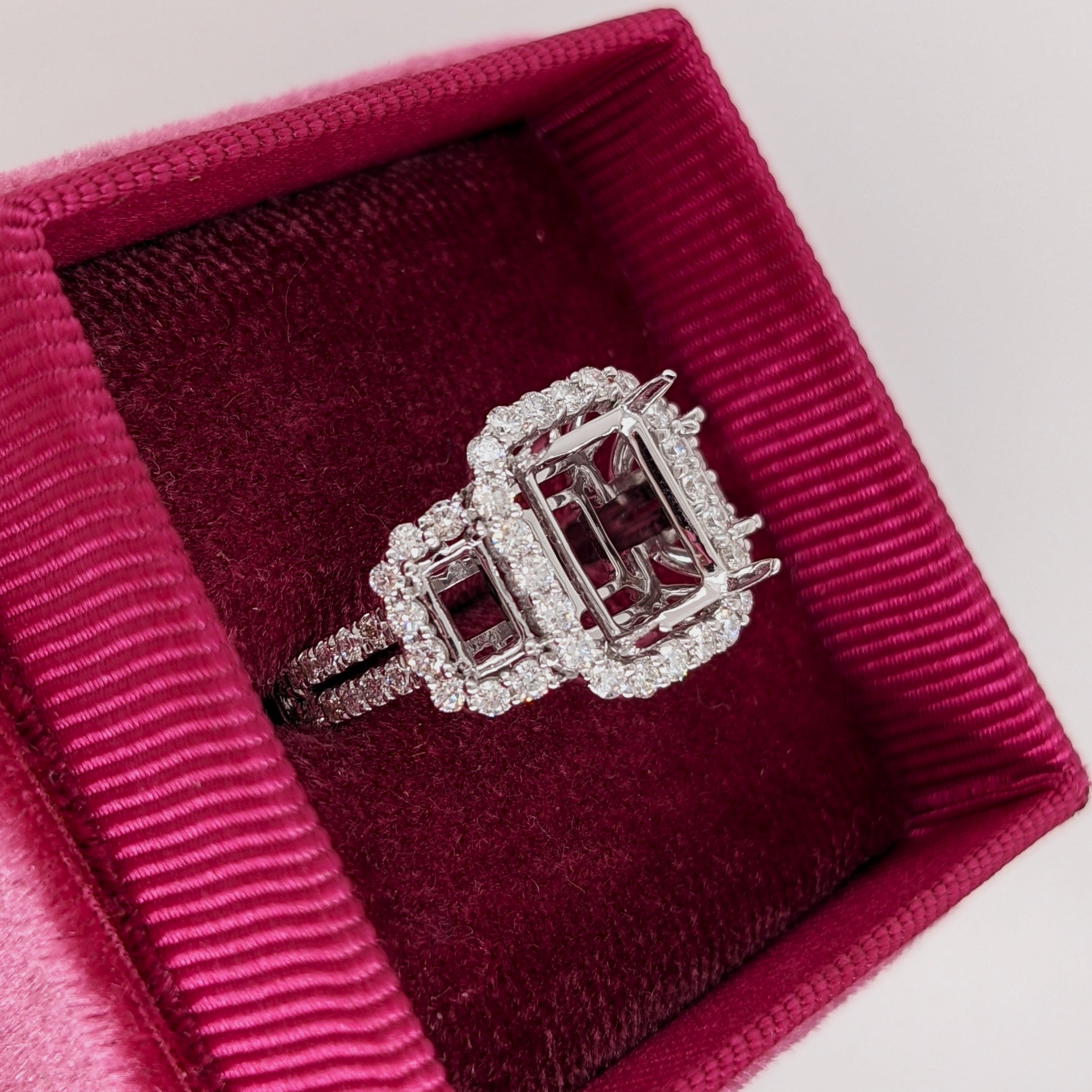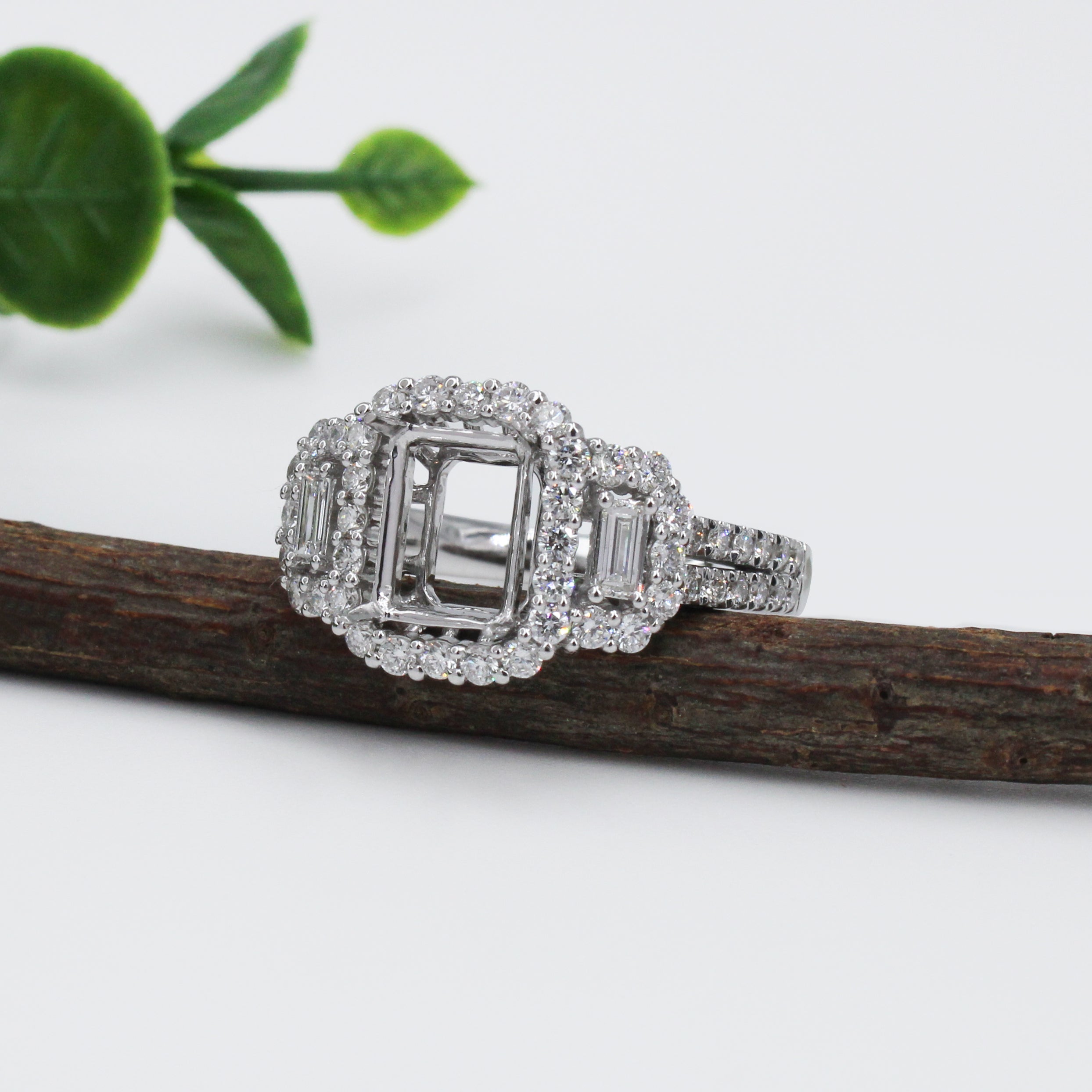 A three stone ring setting featuring 2 baskets for baguette accents of your choice on either side of an emerald cut basket, all surrounded by a halo of natural round diamonds. This ring features a pave split shank. Available in both solid and dual tone gold color options, it can be customized for your center stone.