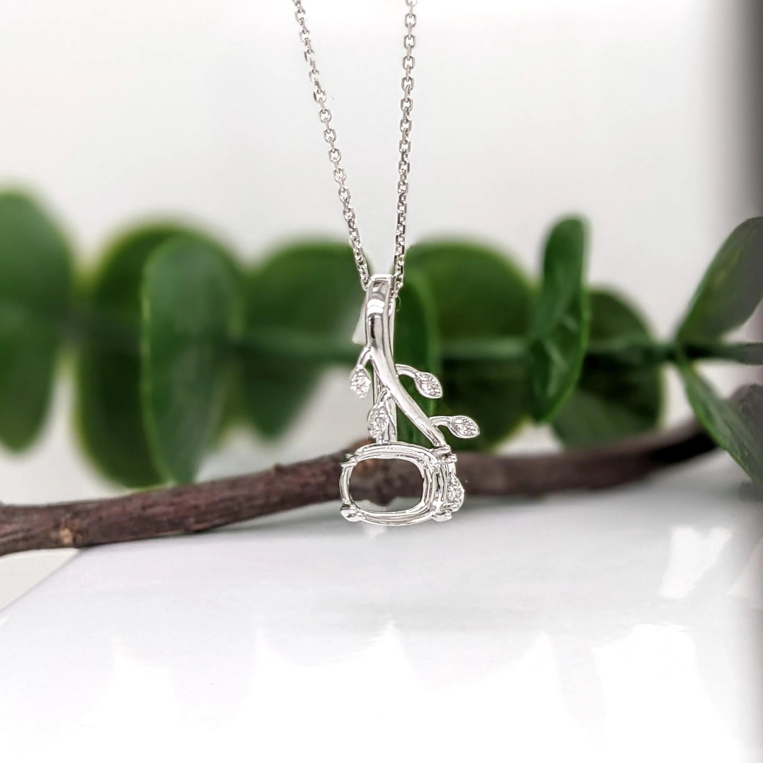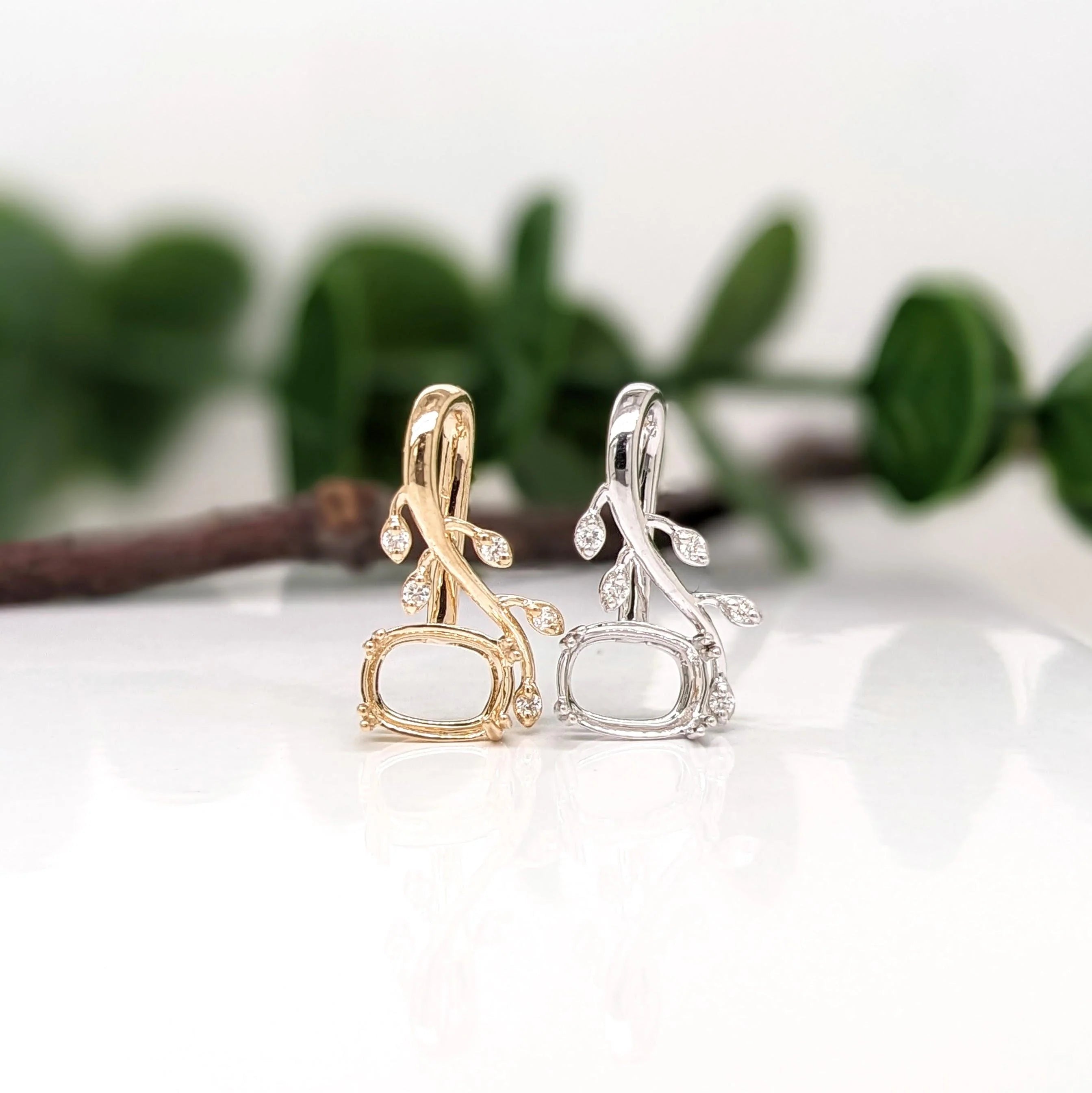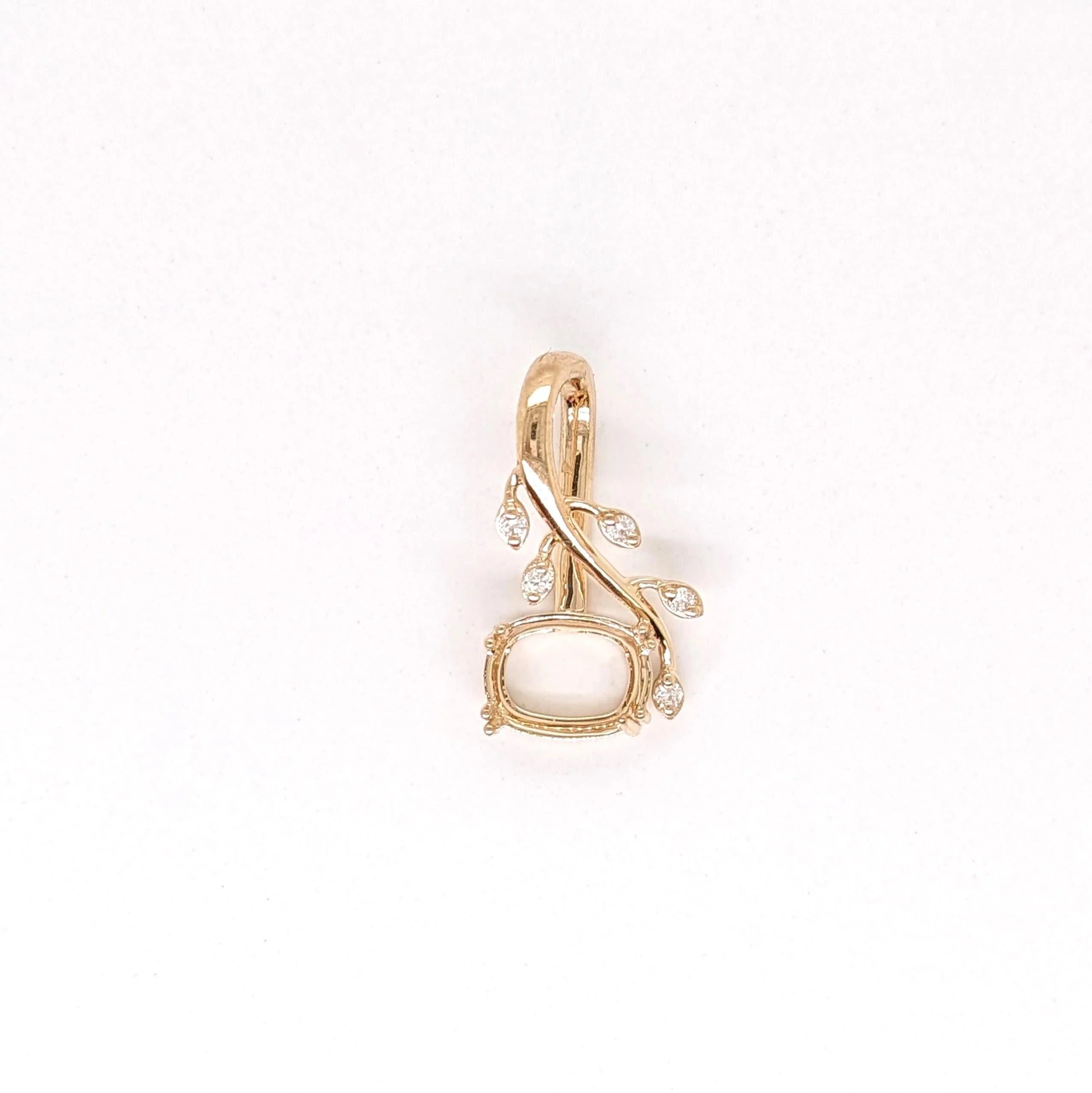 This nature inspired design pendant semi mount features an 8x6mm cushion cut basket with natural earth mined diamonds in a double prong setting, all set in solid 14K gold. This pendant would be perfect for the center gemstone of your choice and can be a lovely birthstone gift for your loved ones!