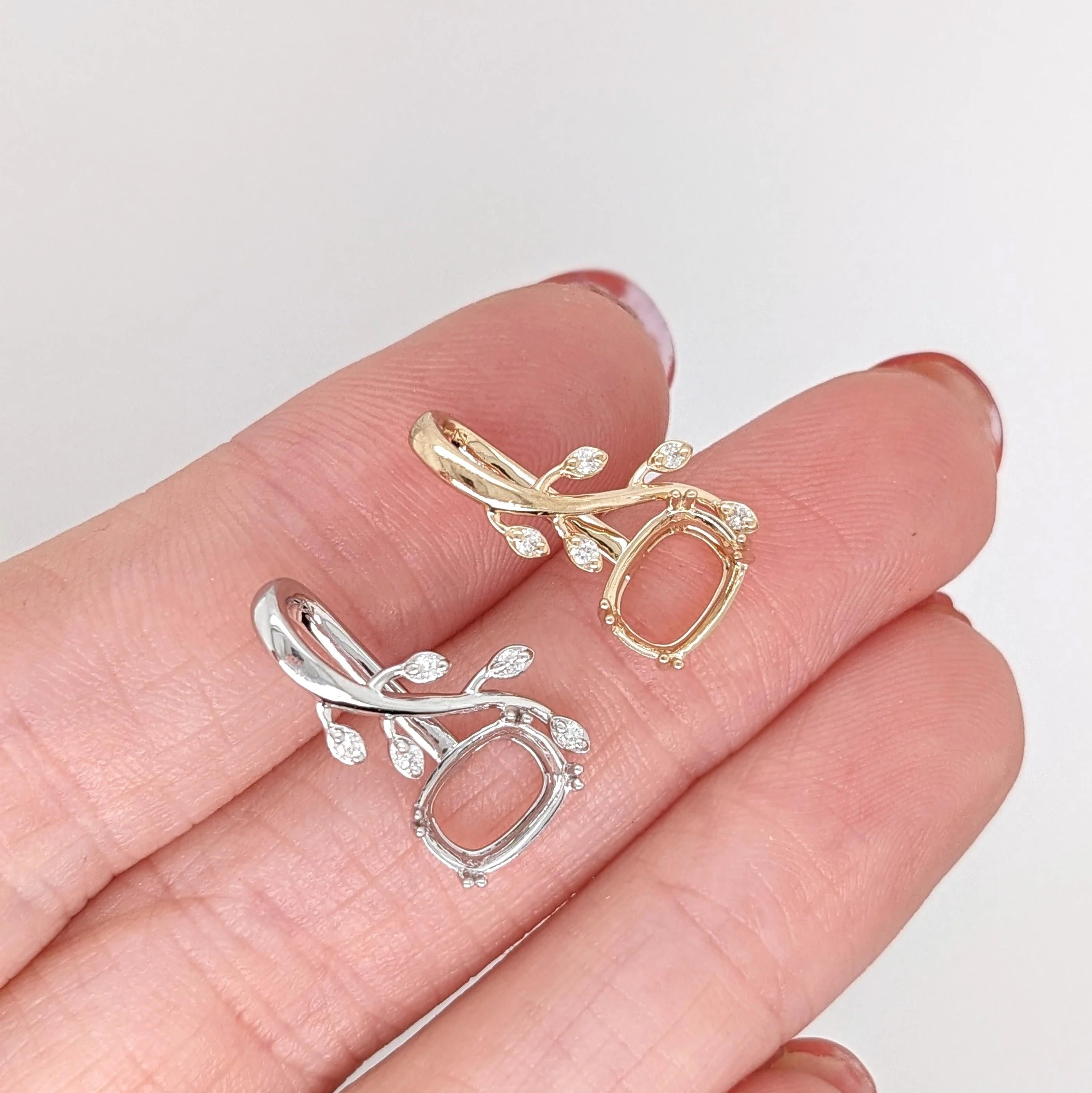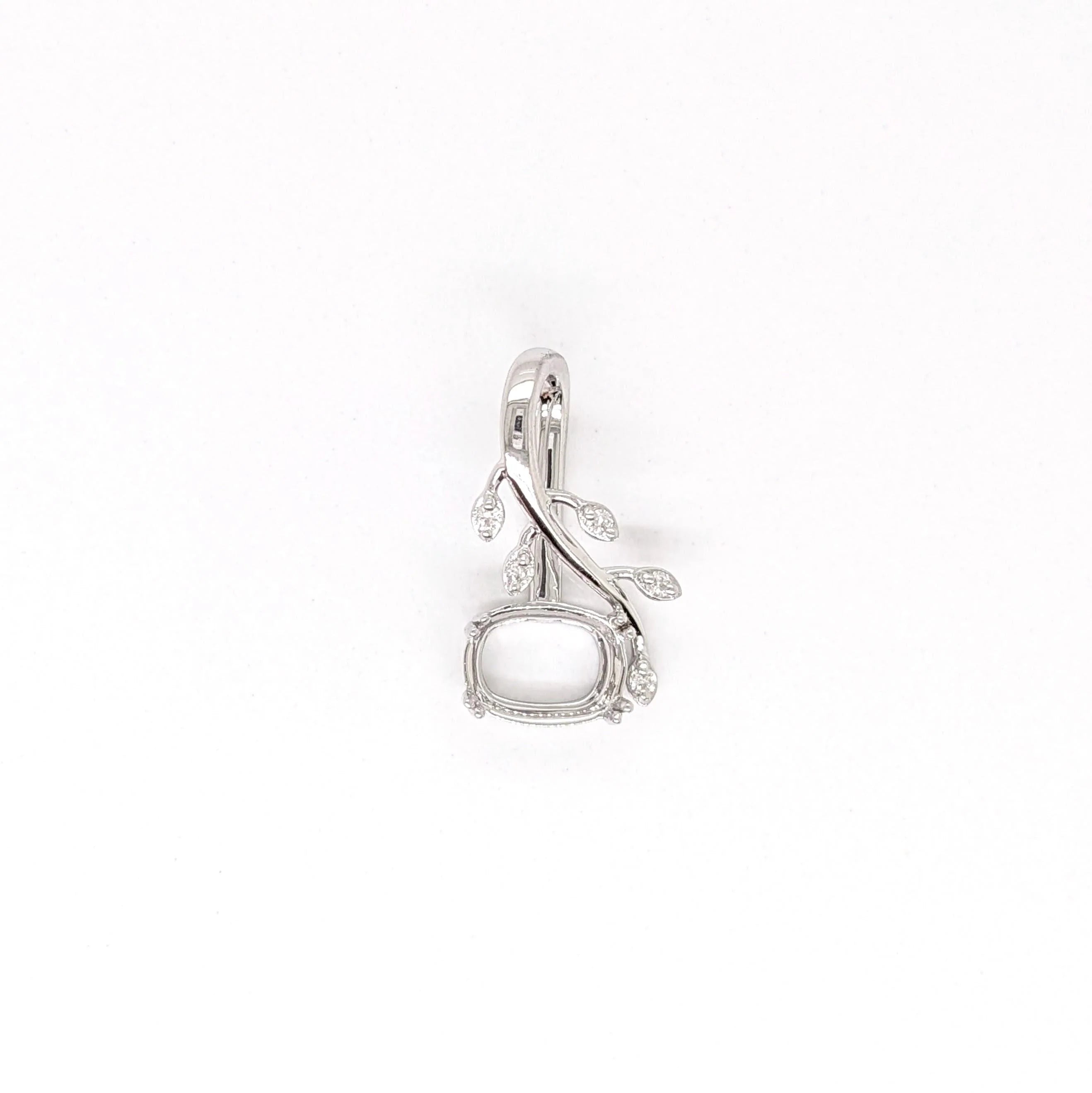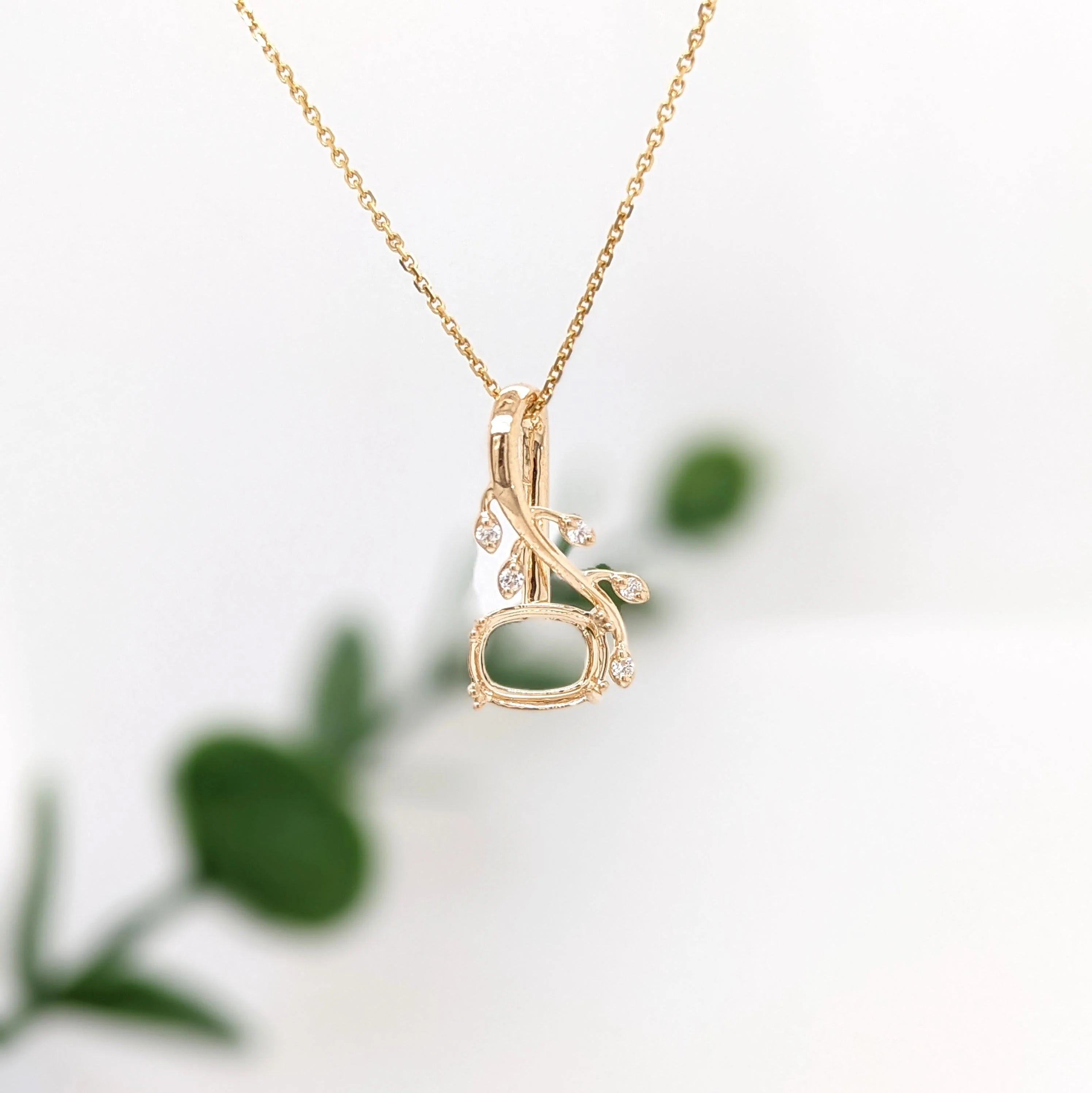 This nature inspired design pendant semi mount features an 8x6mm cushion cut basket with natural earth mined diamonds in a double prong setting, all set in solid 14K gold. This pendant would be perfect for the center gemstone of your choice and can be a lovely birthstone gift for your loved ones!