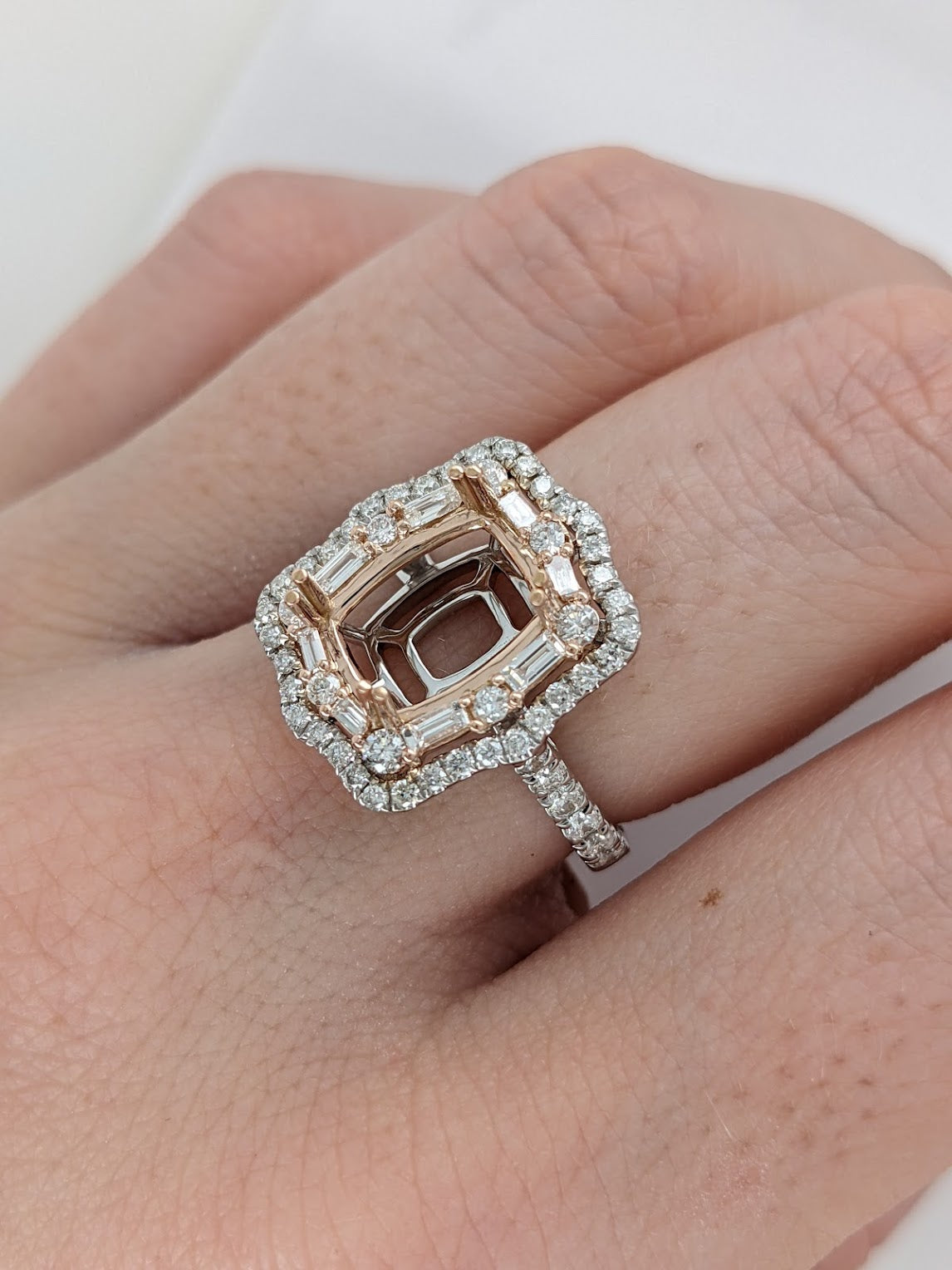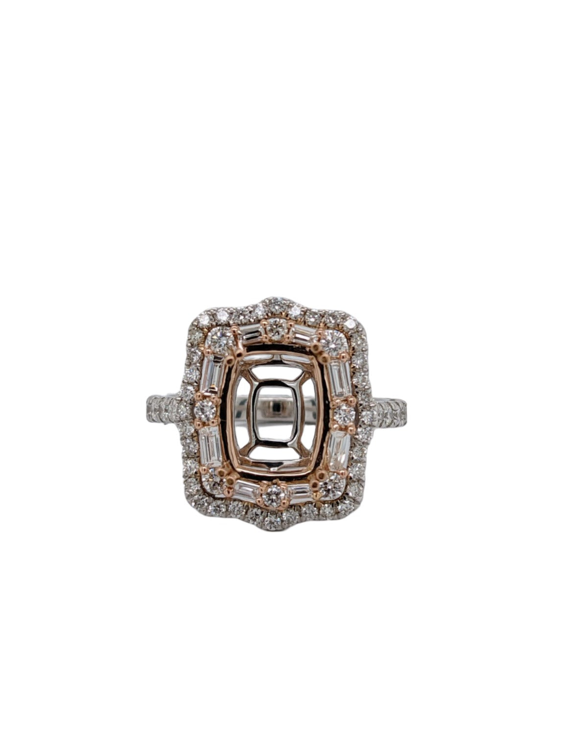 Baguette and round accent diamonds create this unique double halo cushion shape ring setting with a diamond studded straight band. Available in both solid and dual tone gold color options, it can be customized for your center stone.