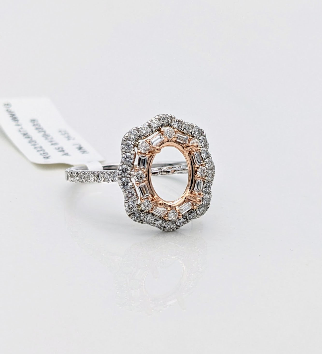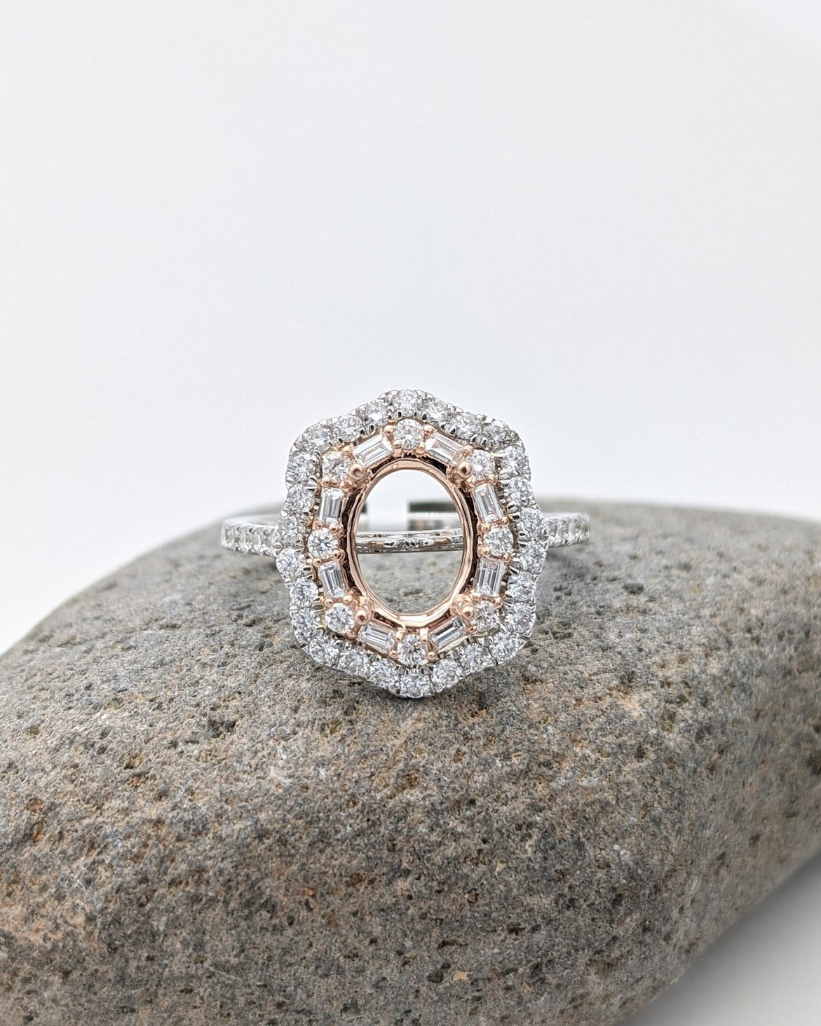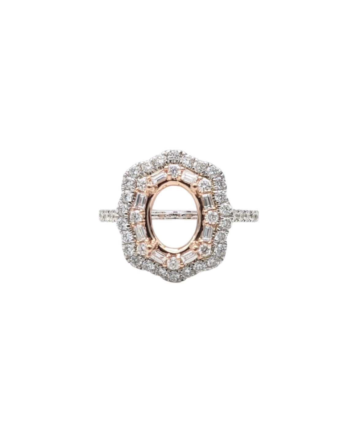 Baguette and round accent diamonds create this unique double halo oval shape ring setting with a diamond studded straight band. Available in both solid and dual tone gold color options, it can be customized for your center stone.