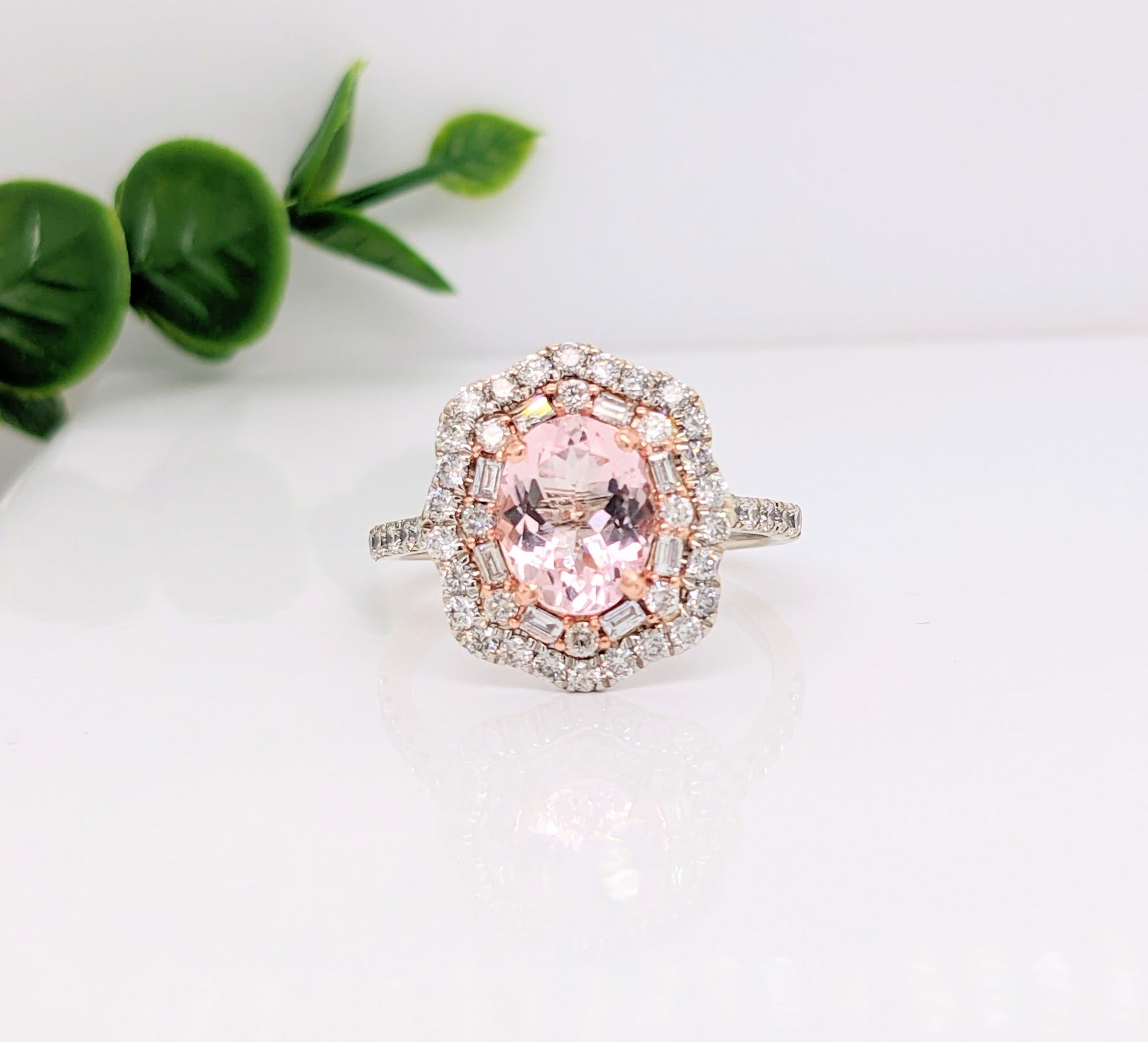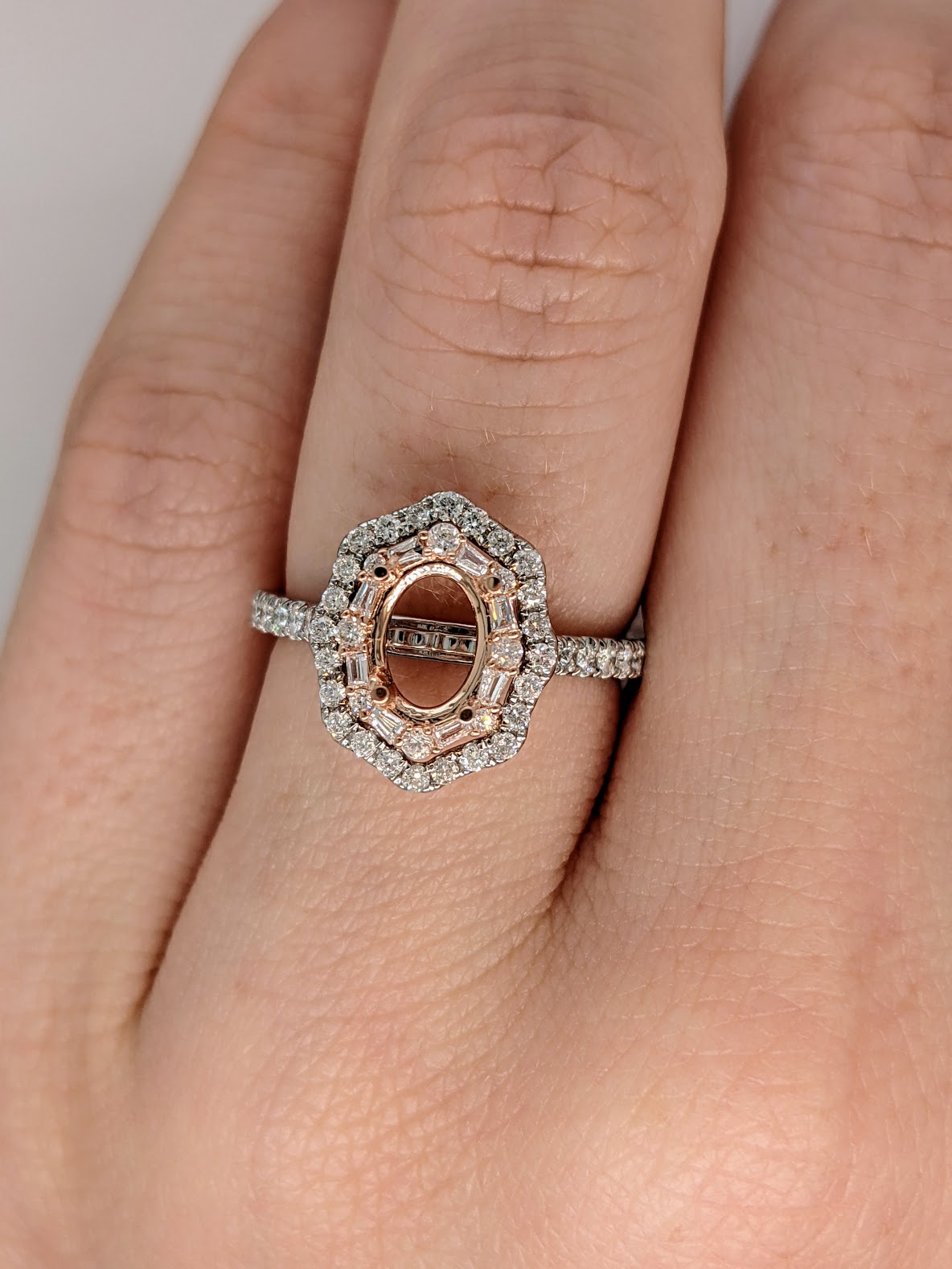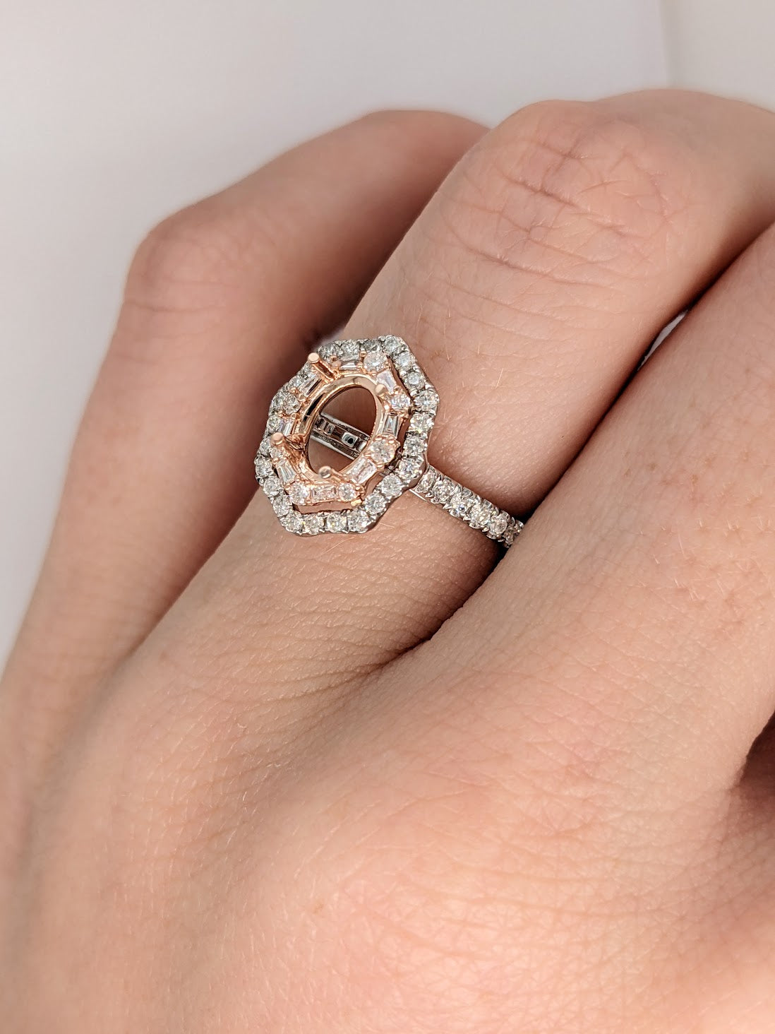 Baguette and round accent diamonds create this unique double halo oval shape ring setting with a diamond studded straight band. Available in both solid and dual tone gold color options, it can be customized for your center stone.