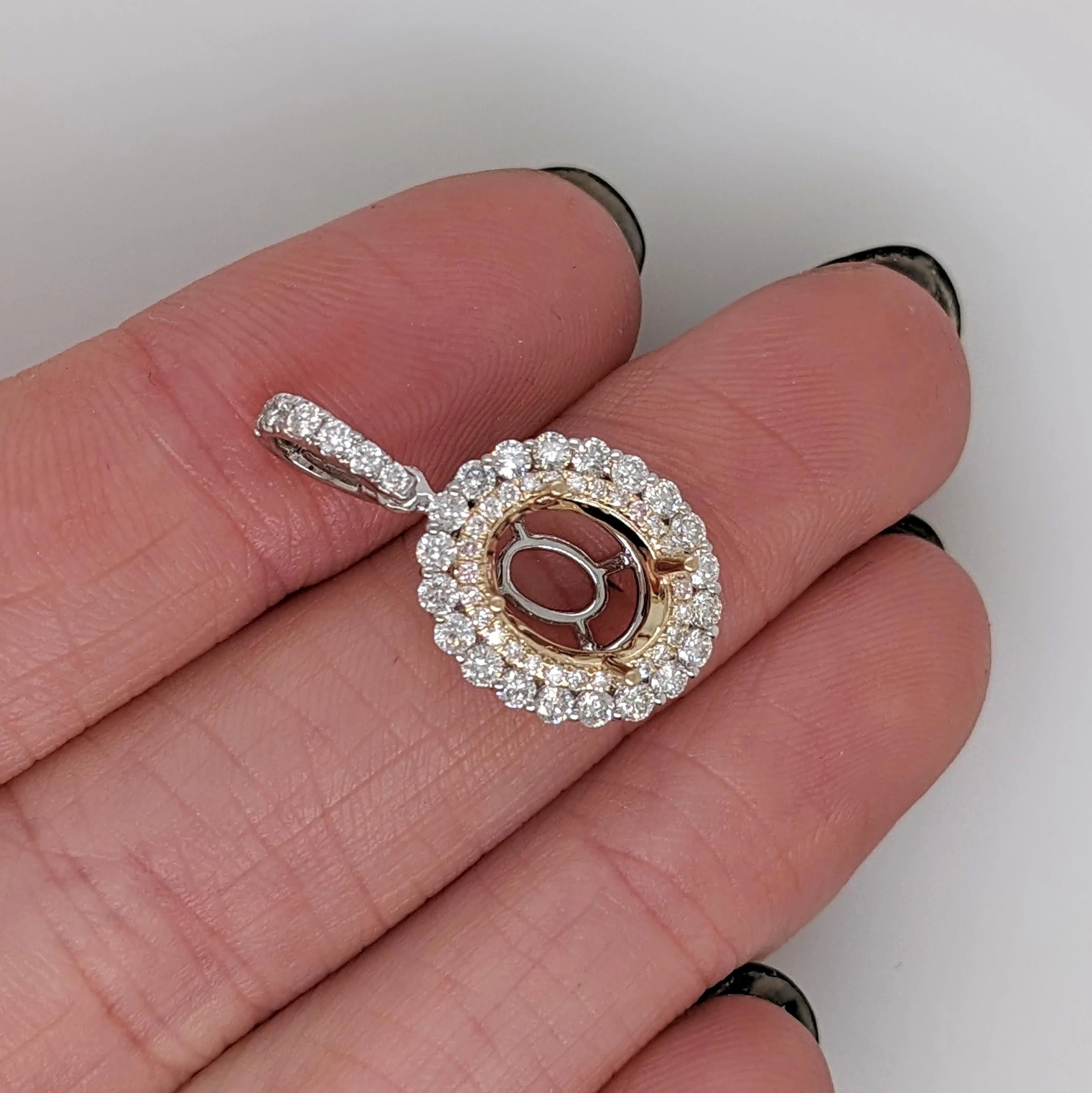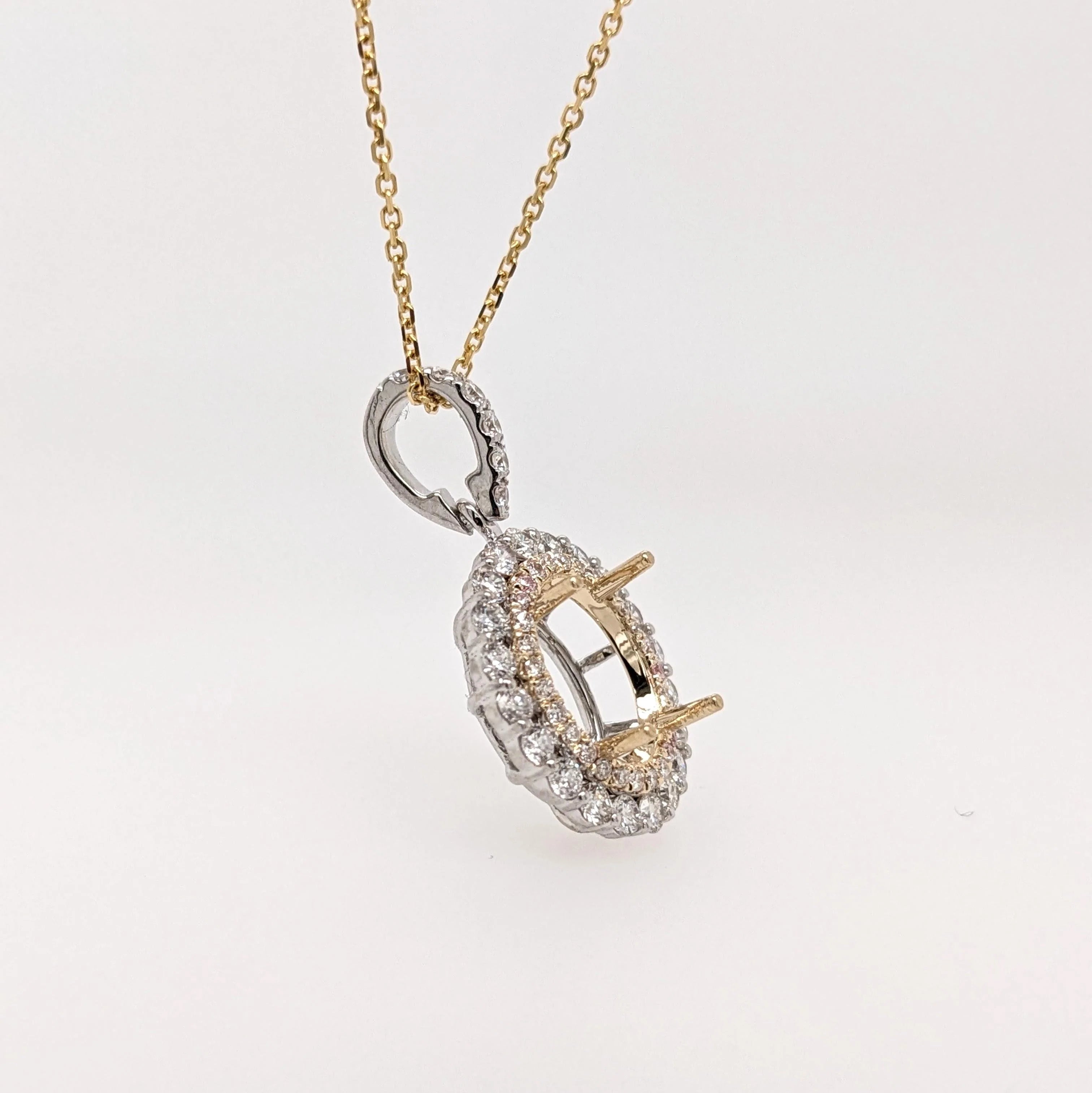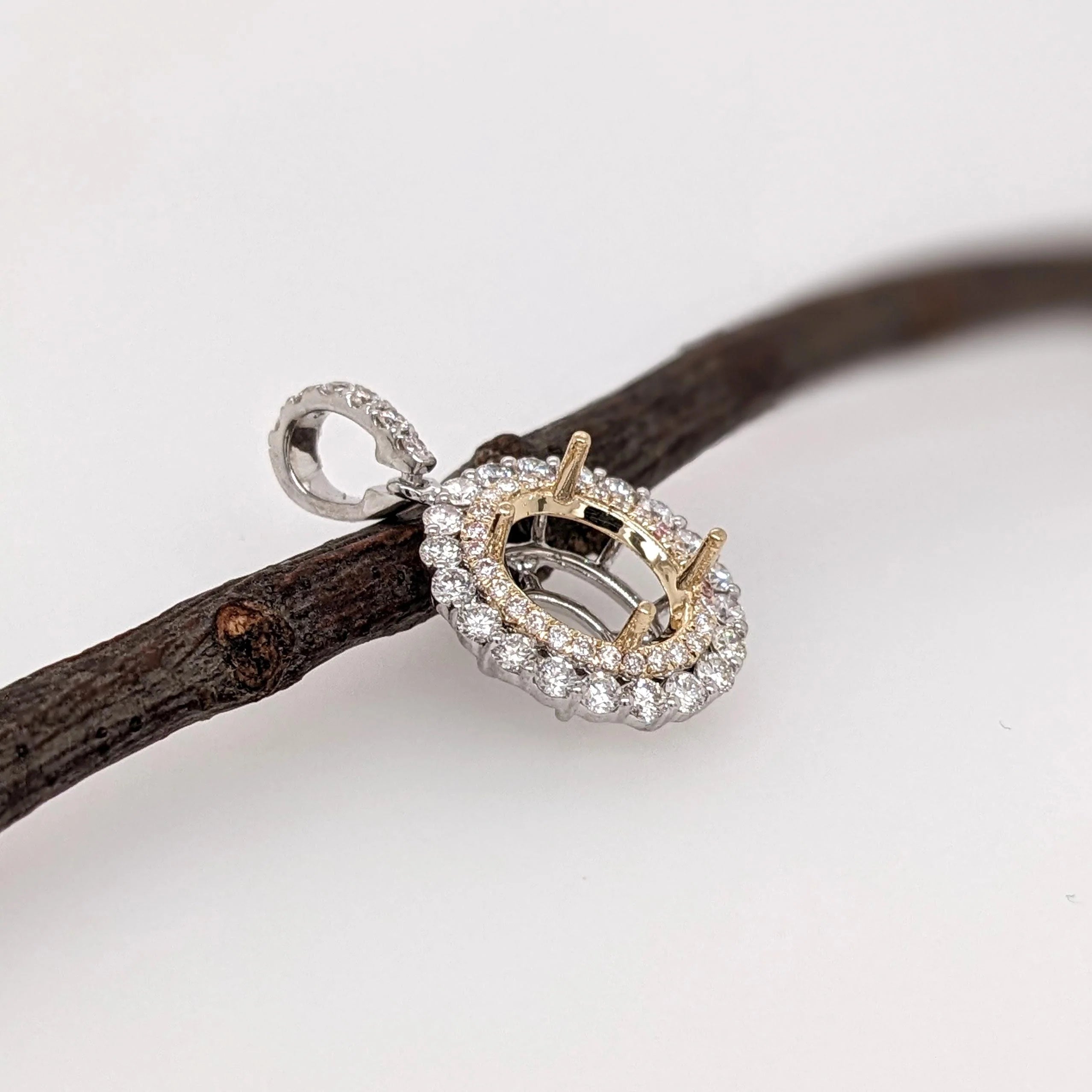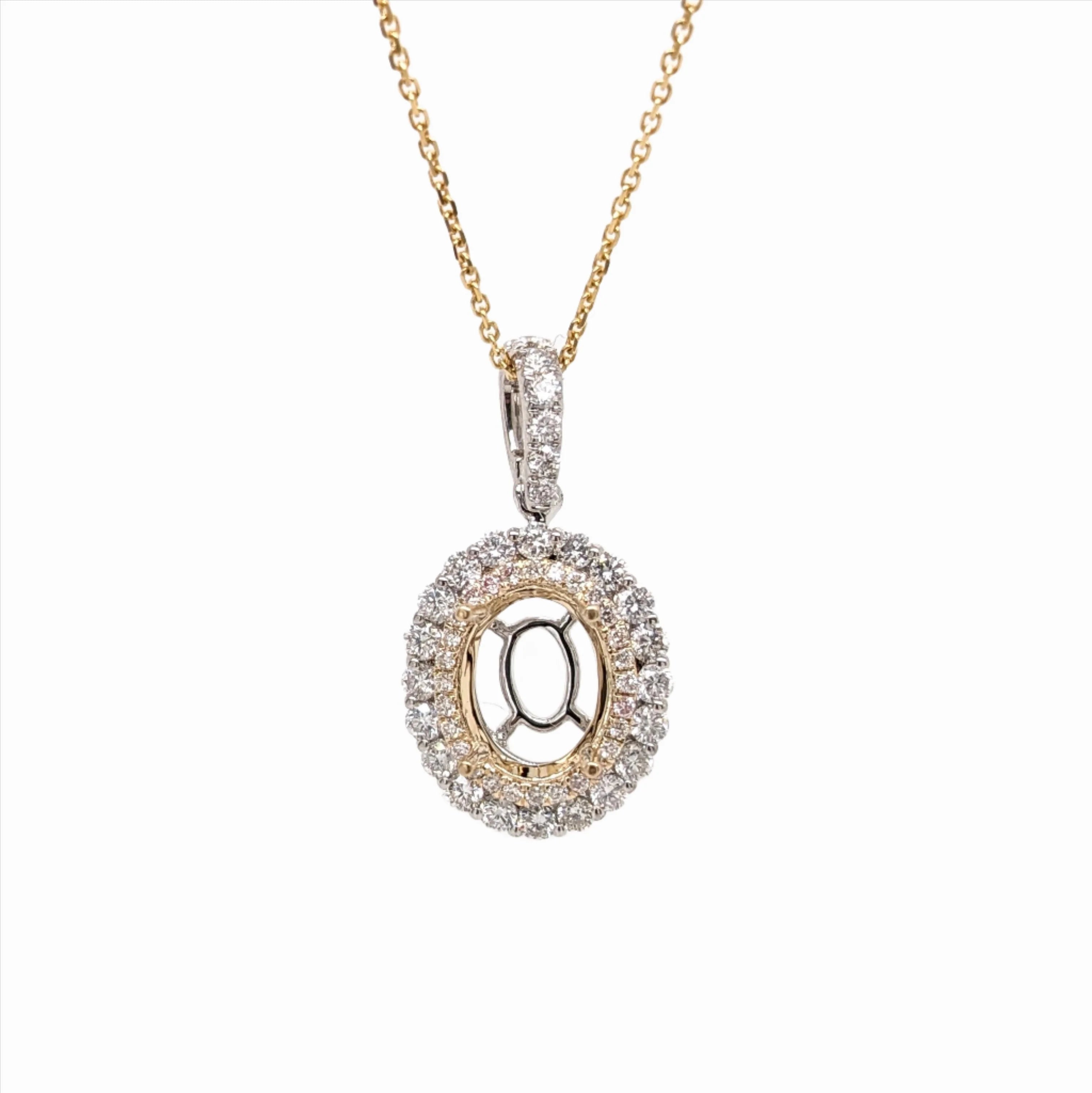 A classic double halo pendant design that can be made in dual or single tones of gold! A lovely option for any gemstone of your choice, with tons of sparkle, including a diamond studded shank. Make this your next timeless heirloom piece.