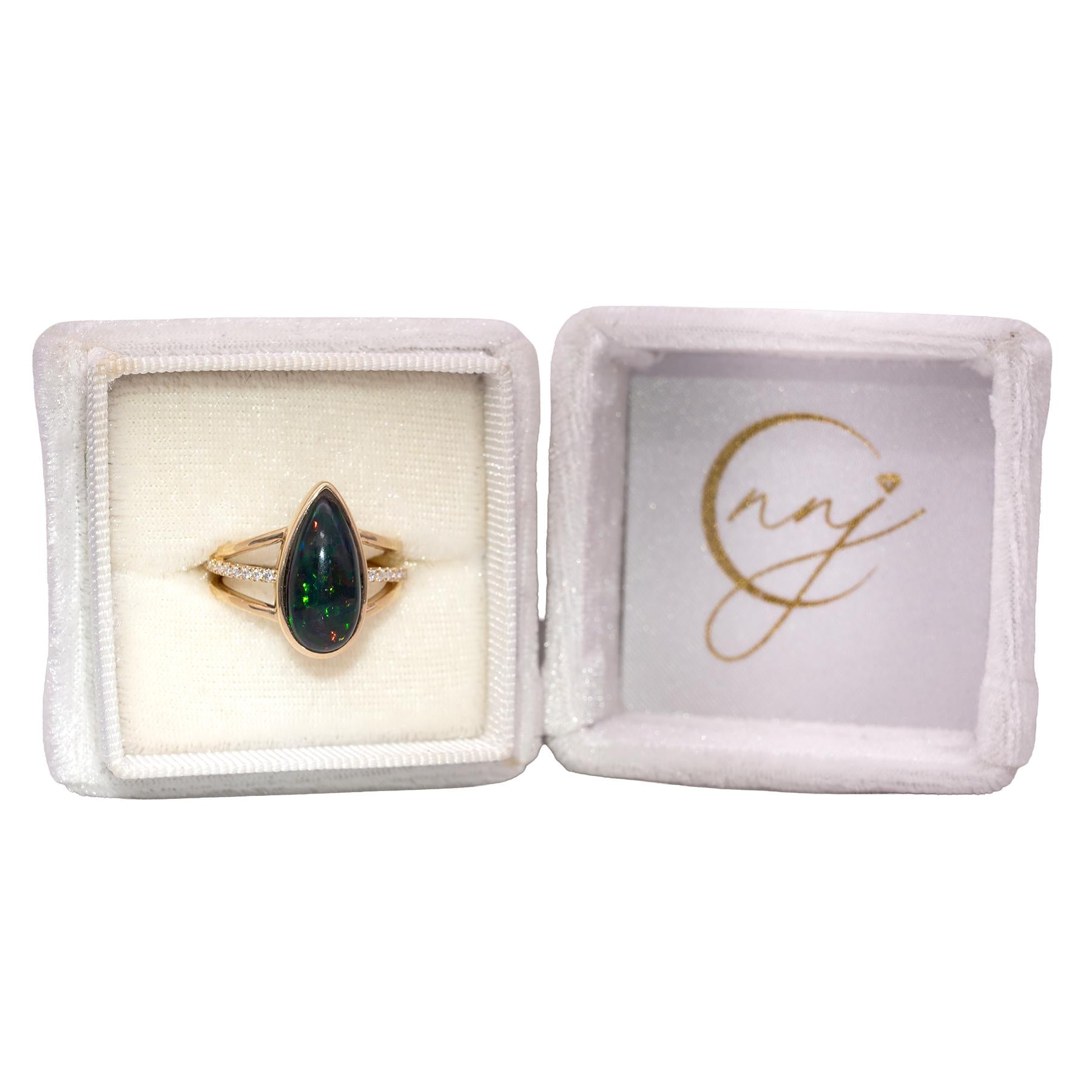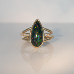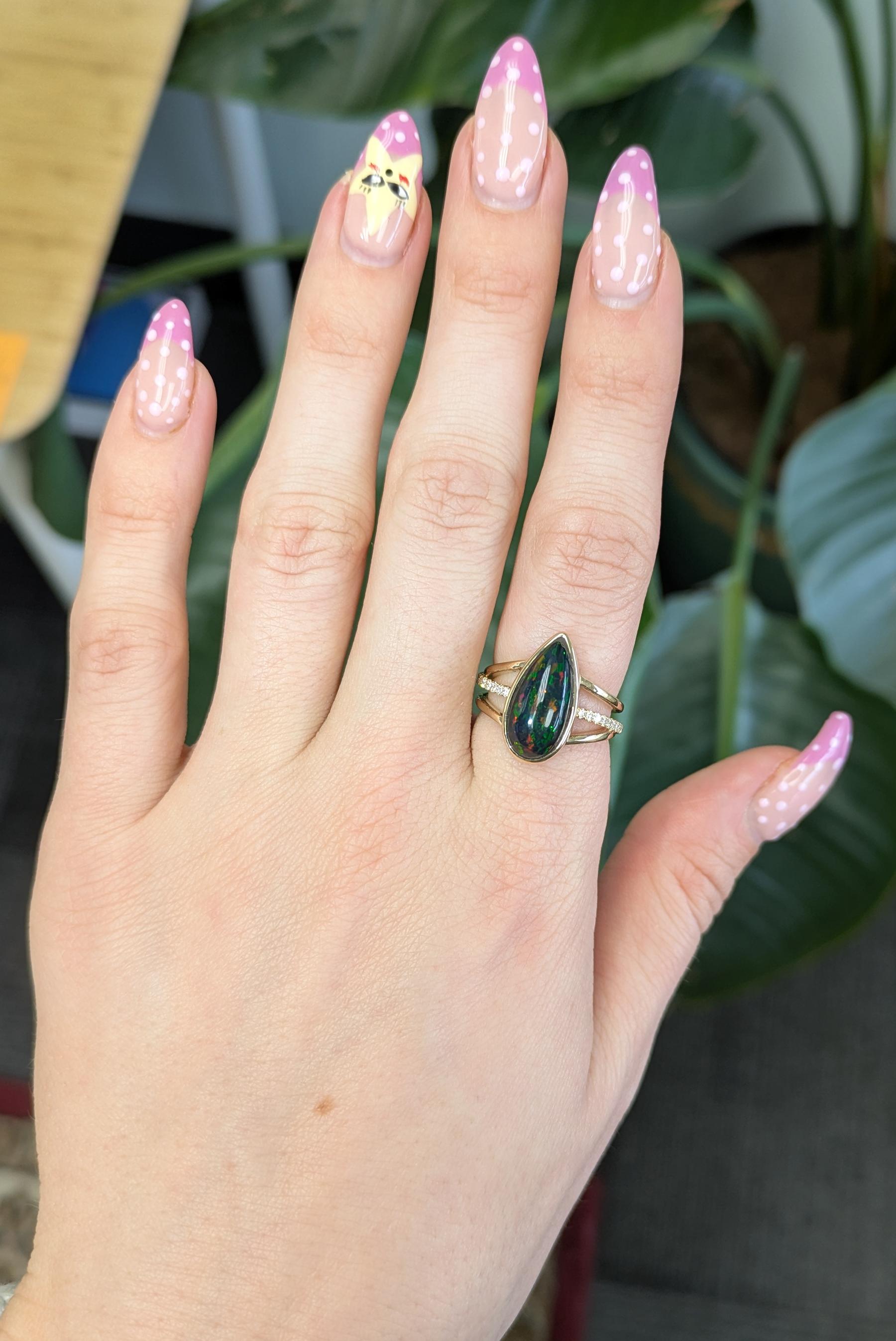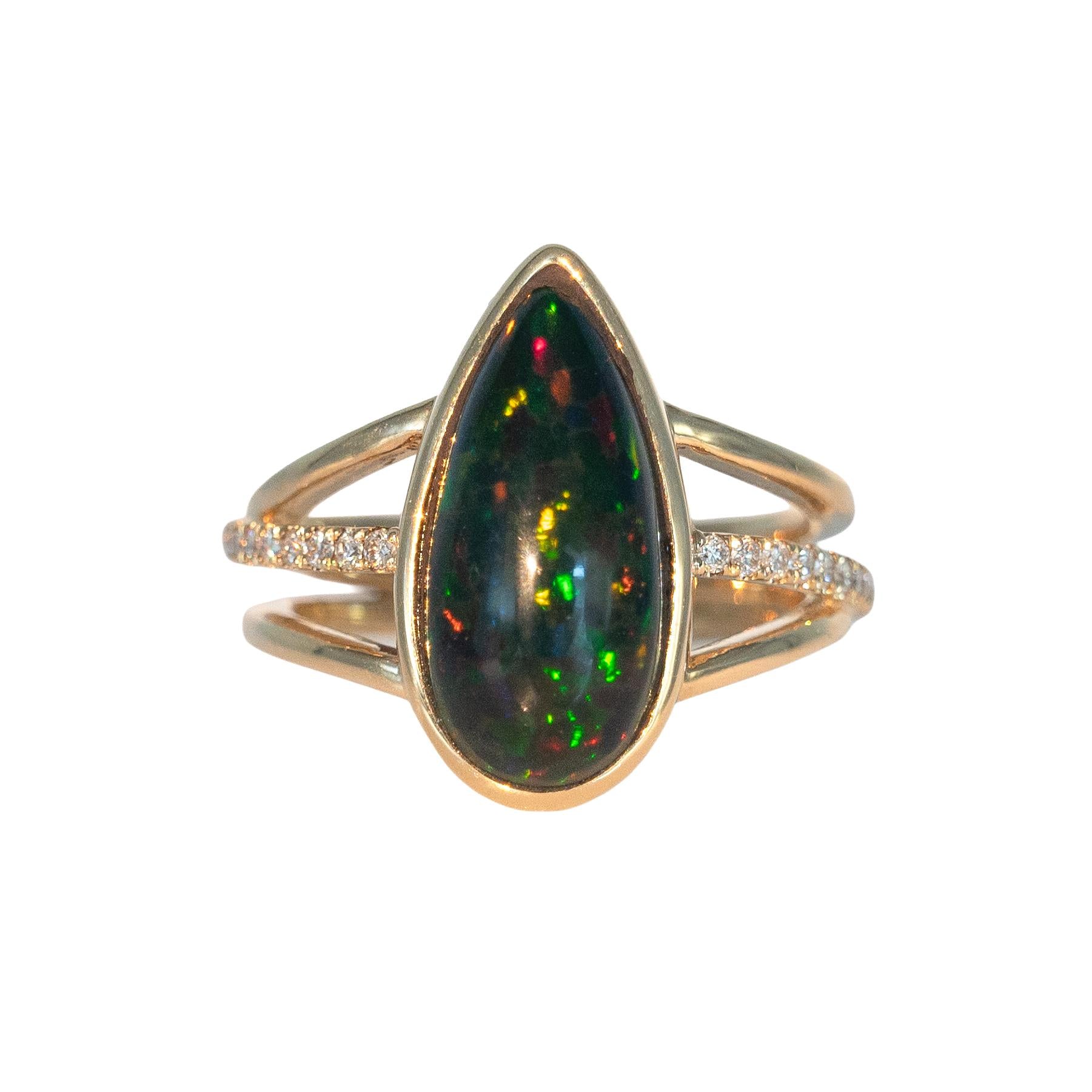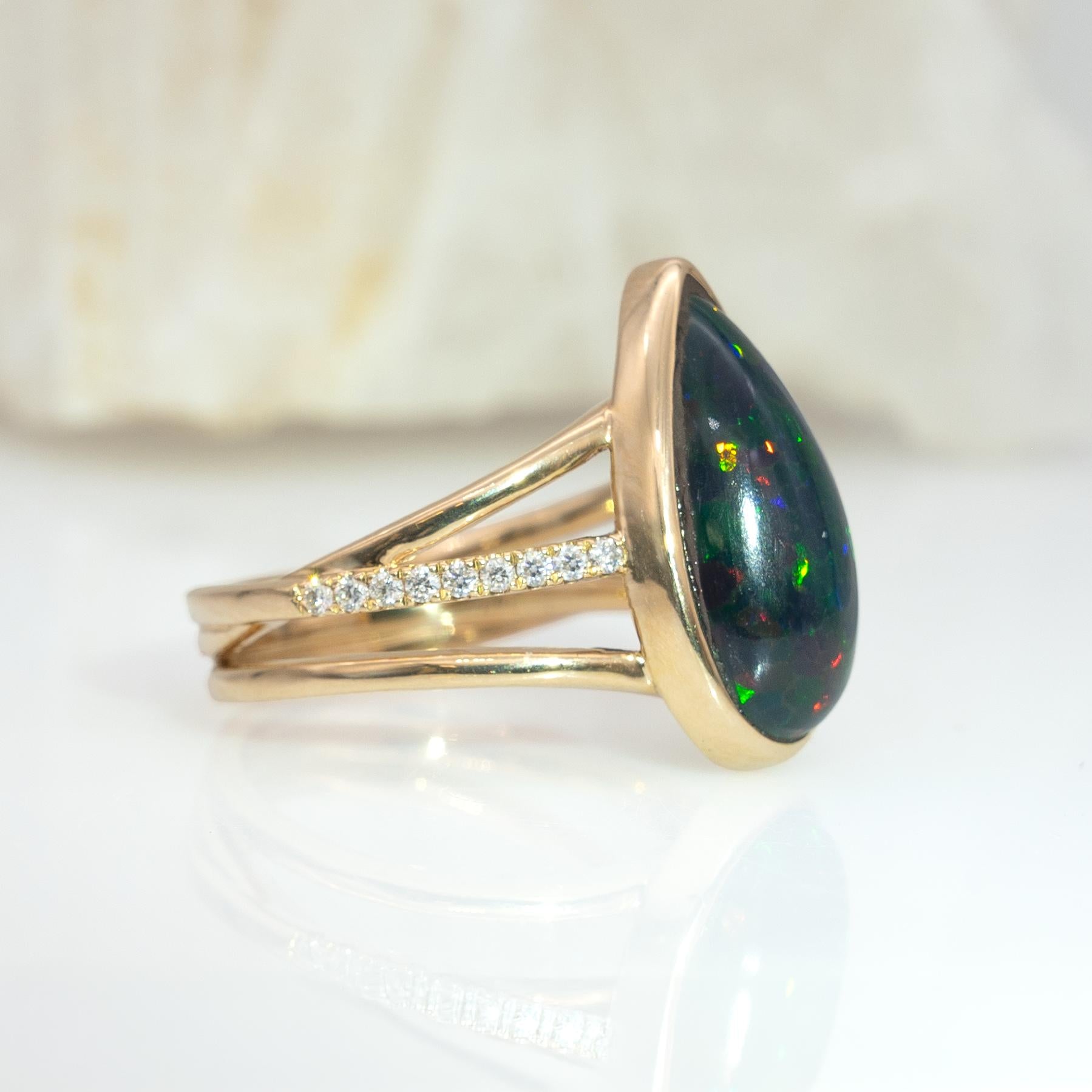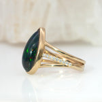 3.2 carat black opal with vibrant play of color in a 16.5x8mm cut