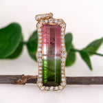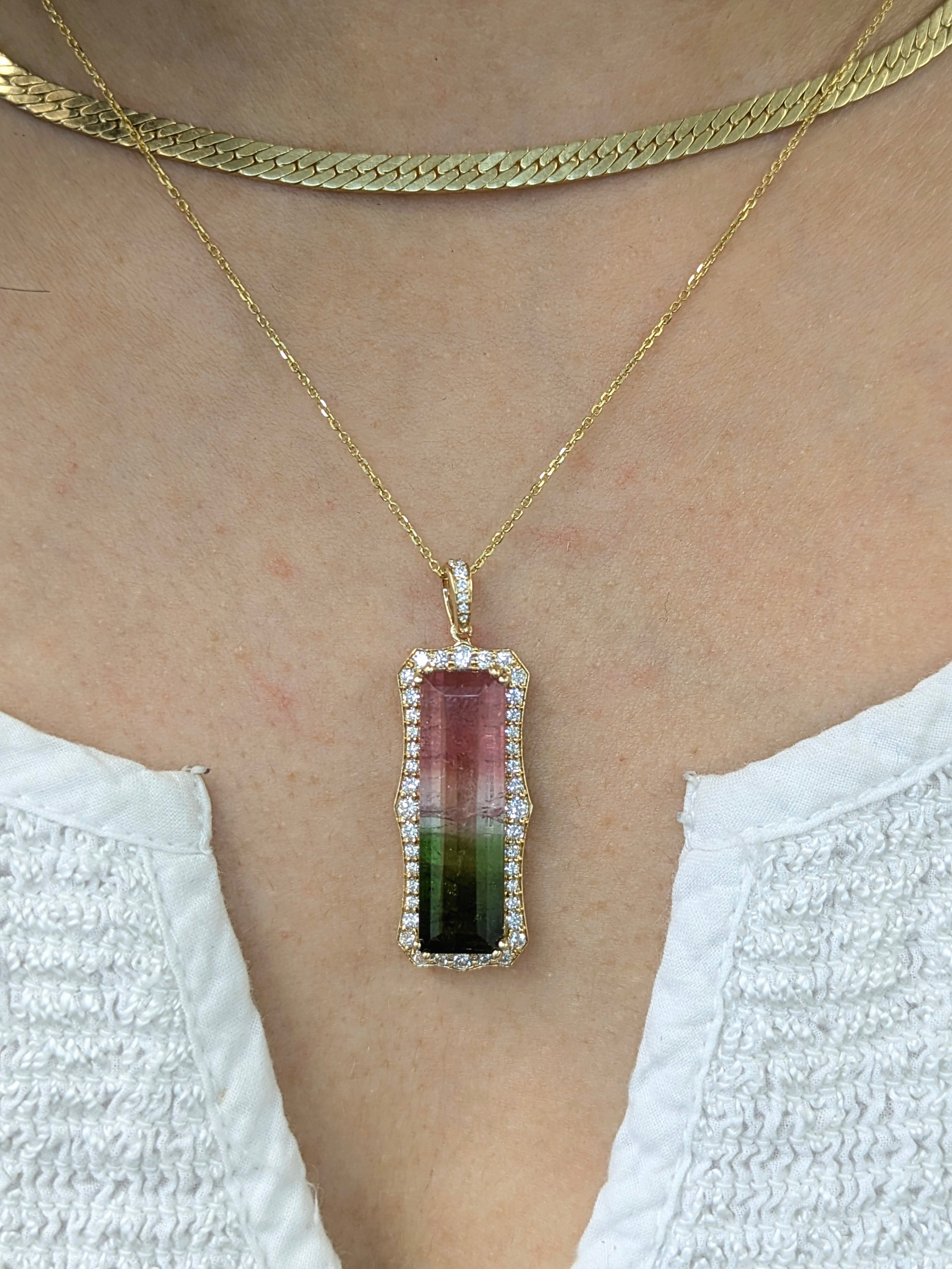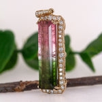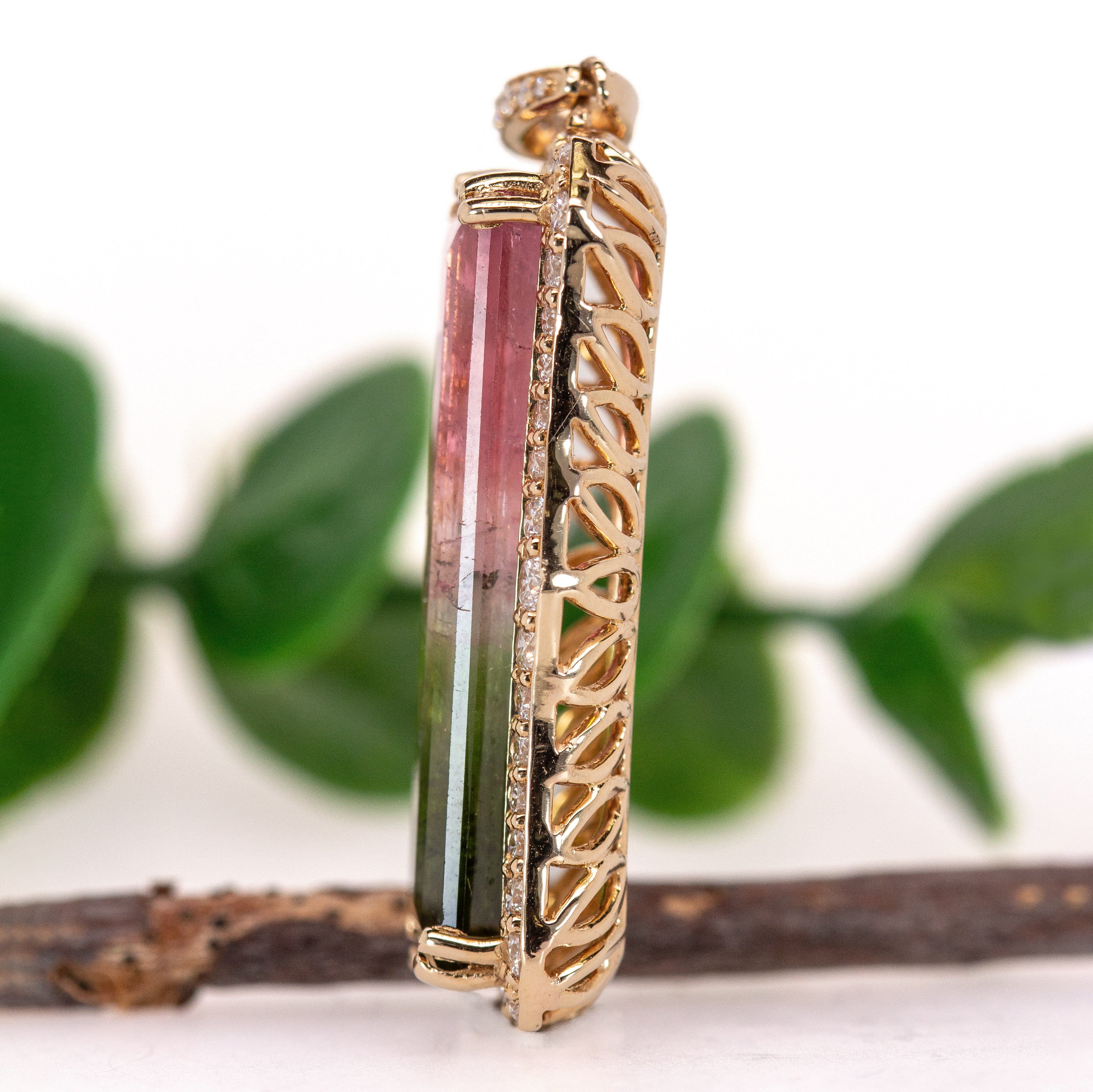 Indulge in the rare beauty of our 10ct Watermelon Tourmaline Pendant, showcasing the stunning pink and green hues that nature perfectly created. This exceptional gemstone, ethically earth-mined, is elegantly set in luxurious 14K yellow gold and adorned with natural diamonds. The substantial 26.5x8mm size makes a bold statement while the vibrant tourmaline captures attention with its unique color transition that mimics its namesake fruit.