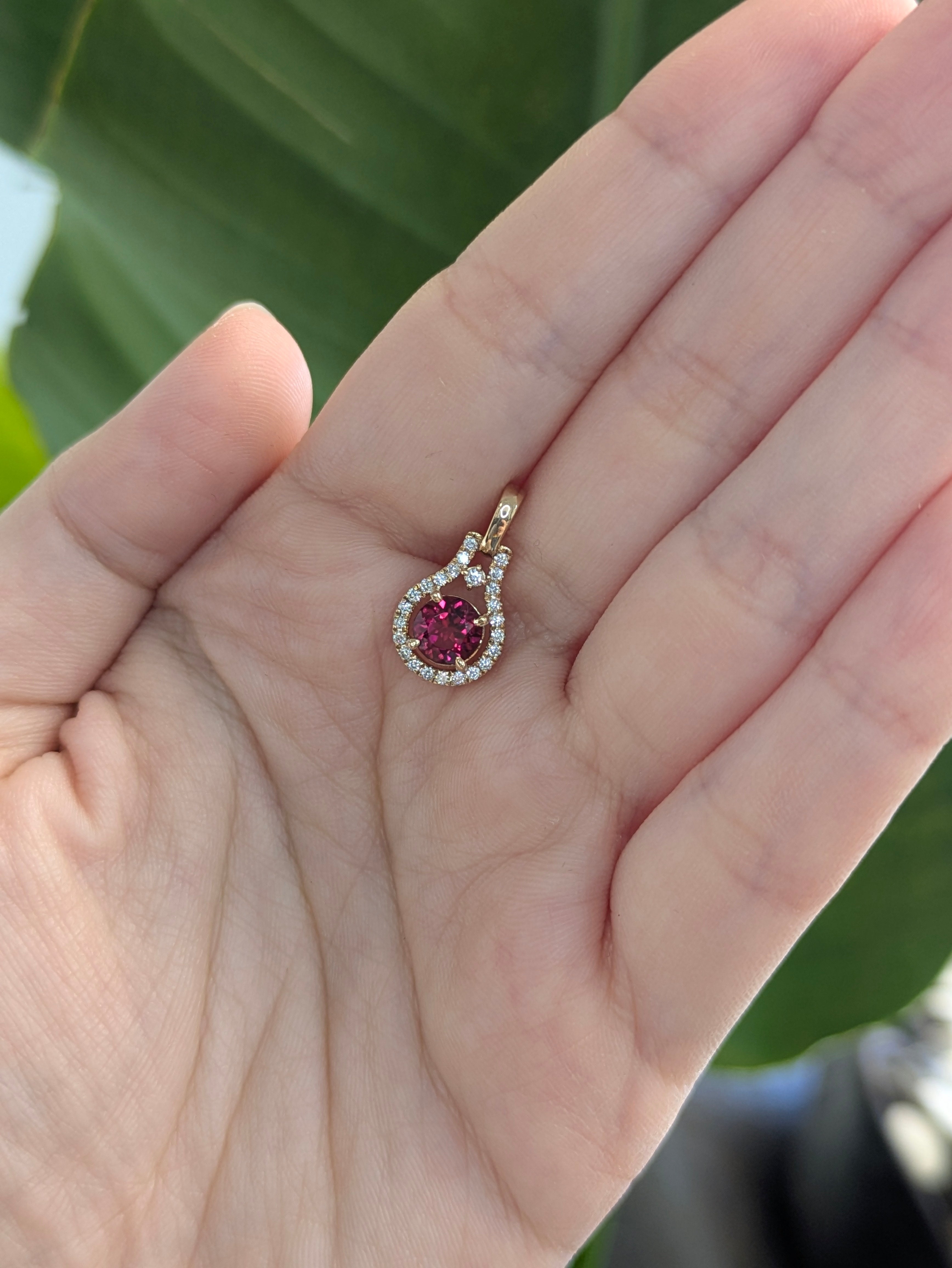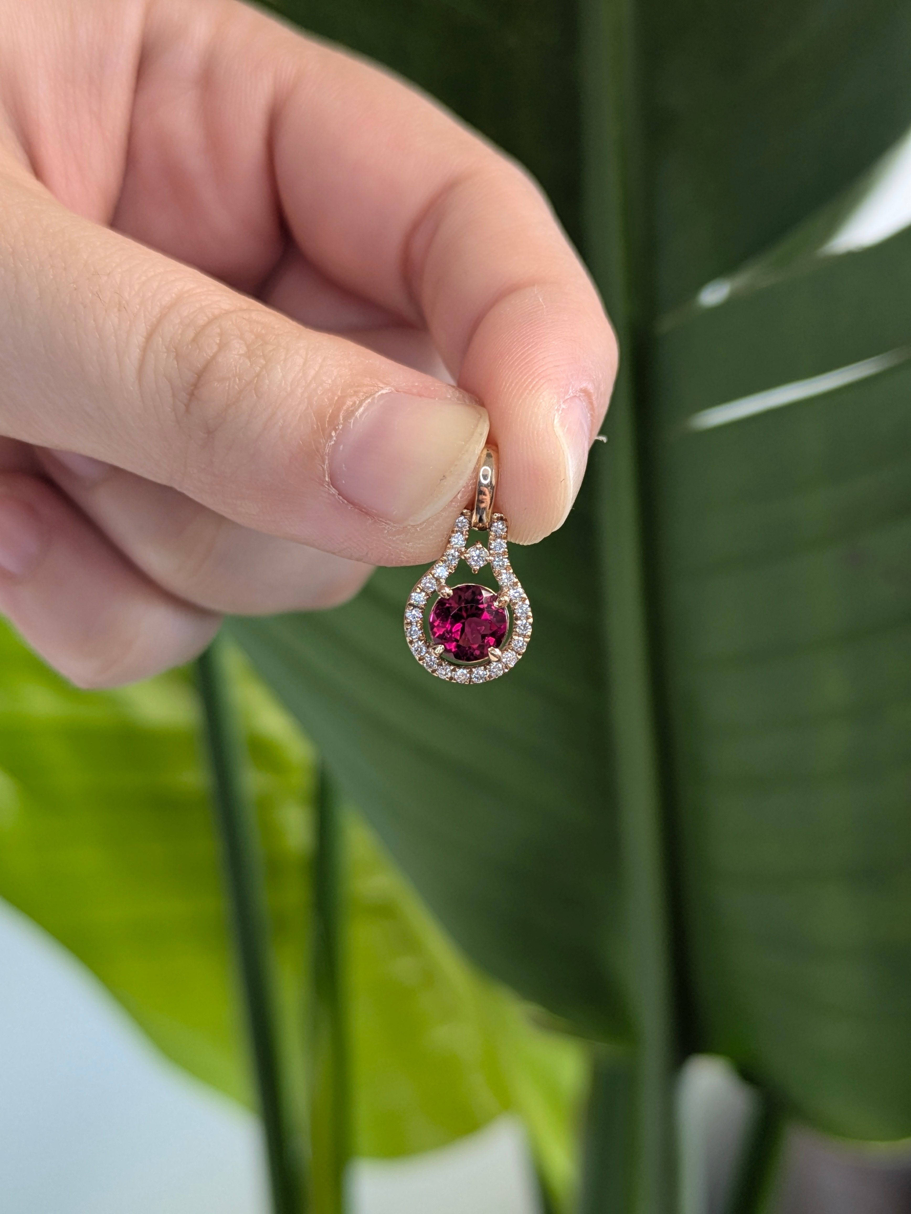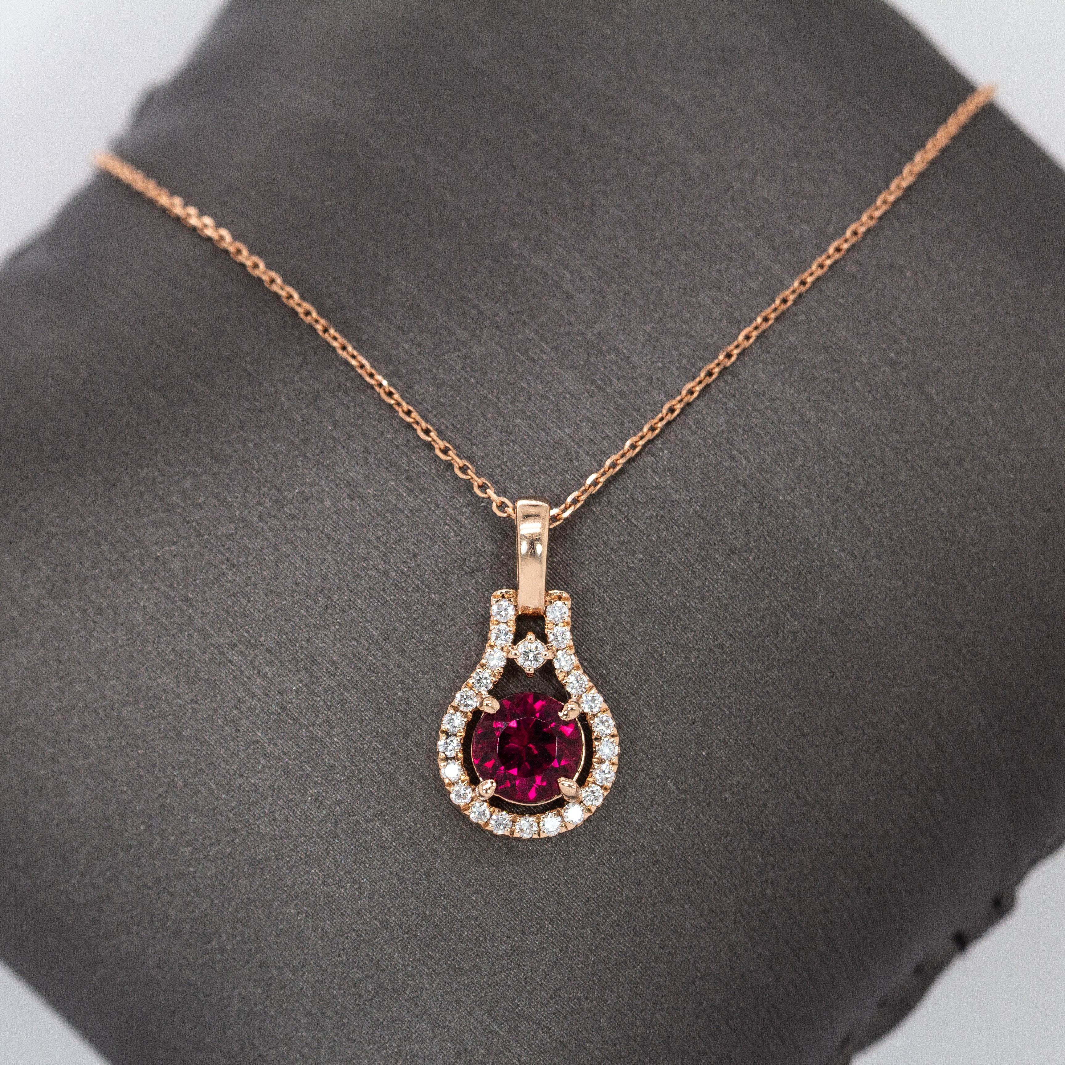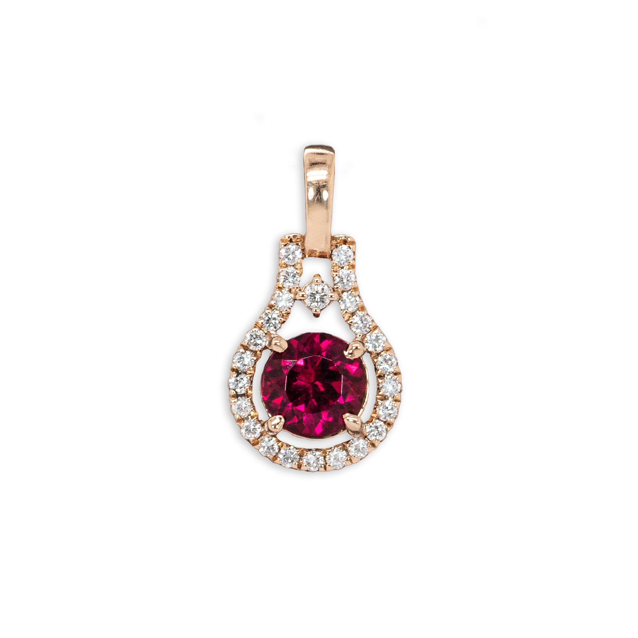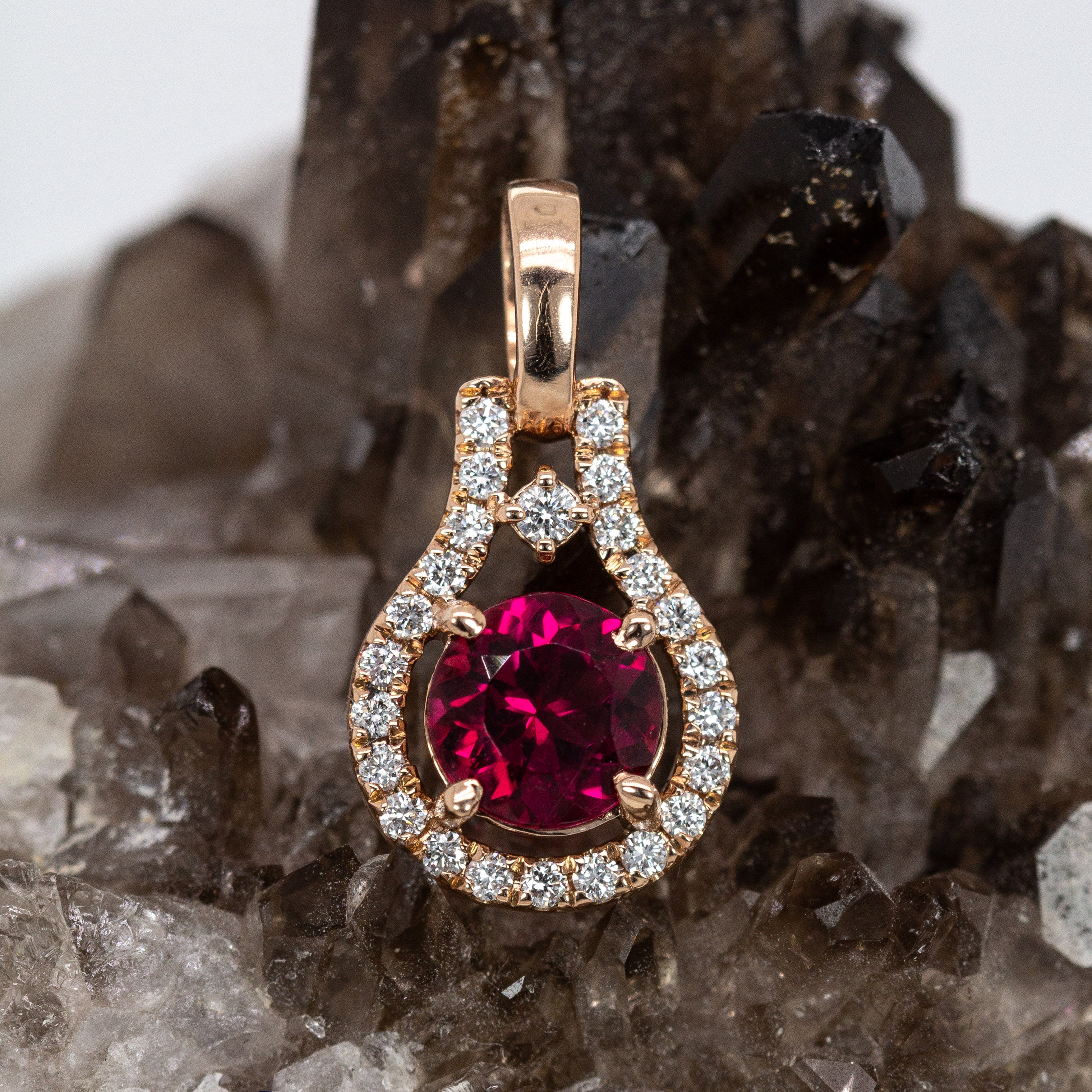 Celebrate timeless beauty with this exquisite pendant showcasing a 0.73 carat round 6mm rubellite tourmaline sourced from the renowned gem mines of Brazil. Known for its vivid, deep red hue and exceptional clarity, this ruby is the centerpiece of genuine luxury.