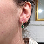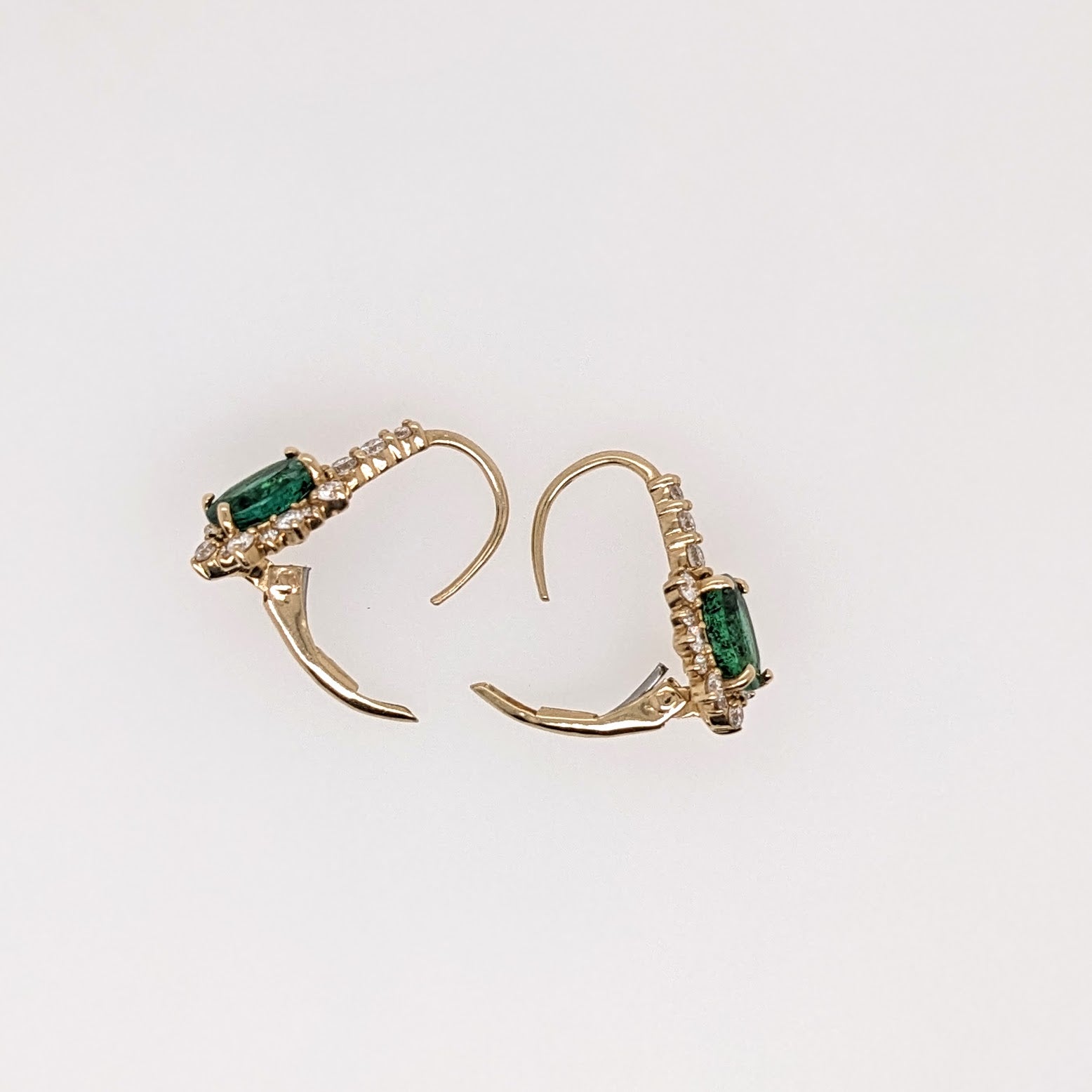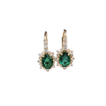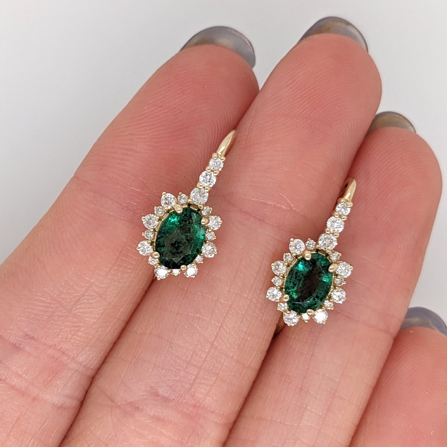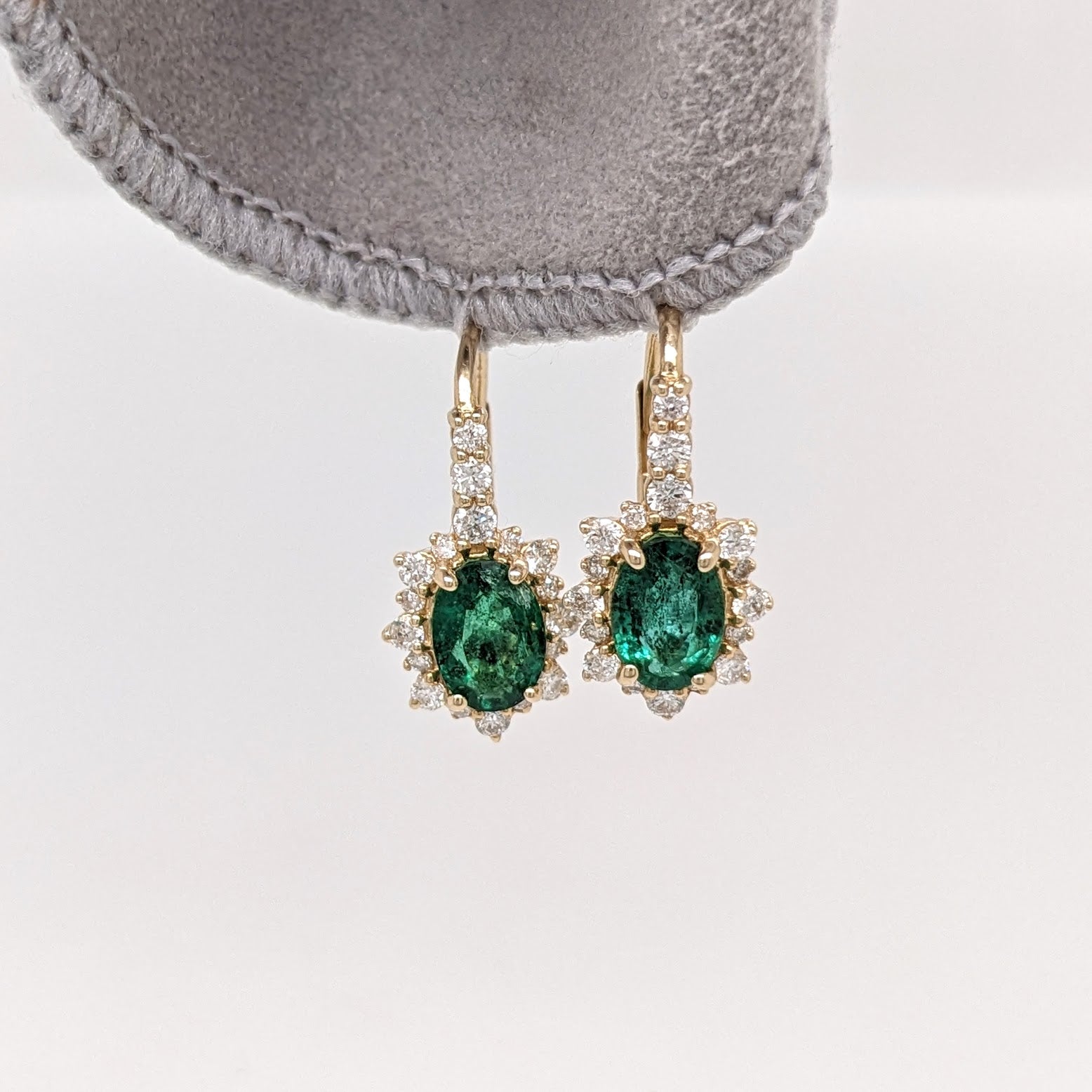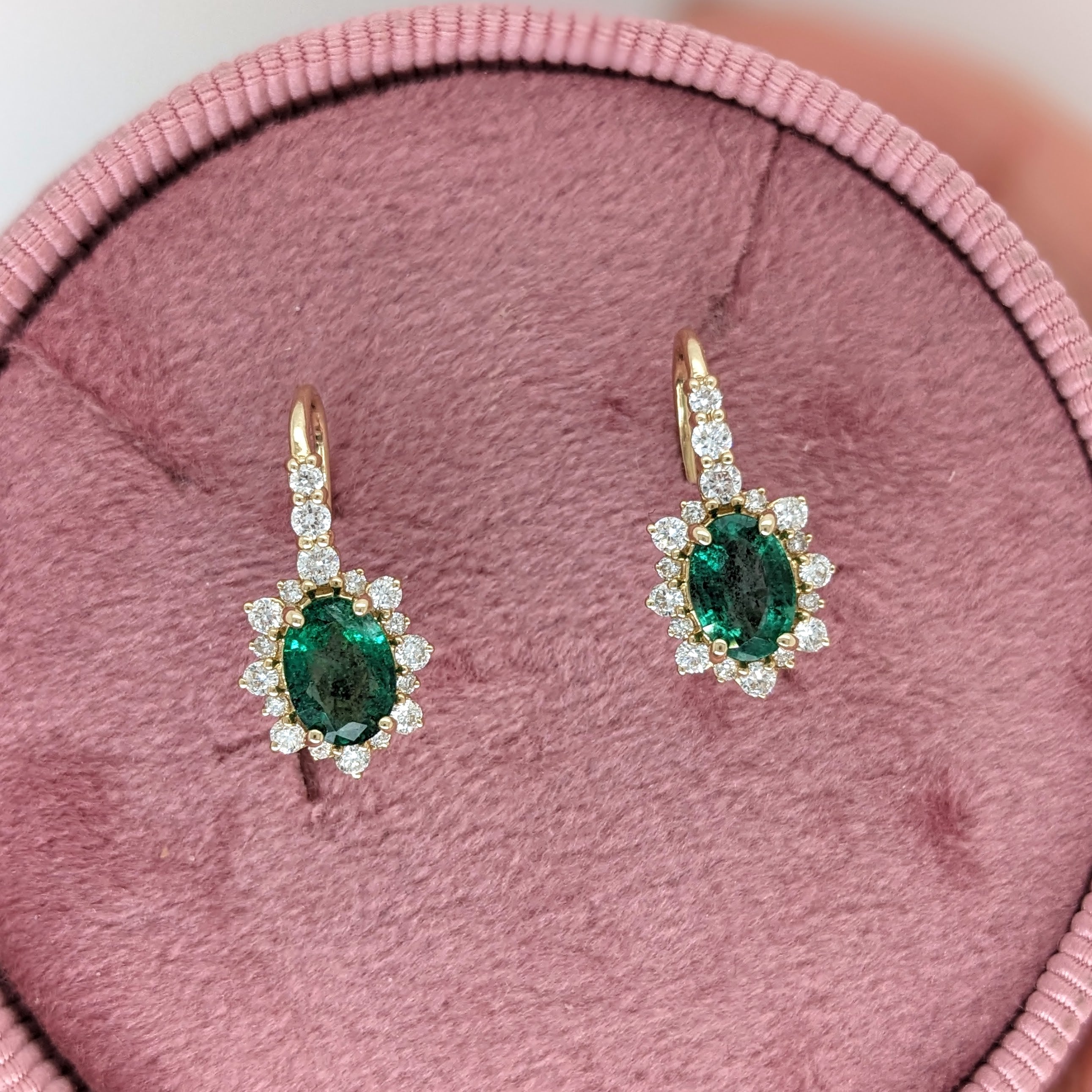 These beautiful pair of drop earrings feature 2.25 carat weight oval emerald gemstones with a halo of natural earth mined diamonds and a diamond studded bail, all set in solid 14K gold. These earrings can be a beautiful birthstone gift for your loved ones!